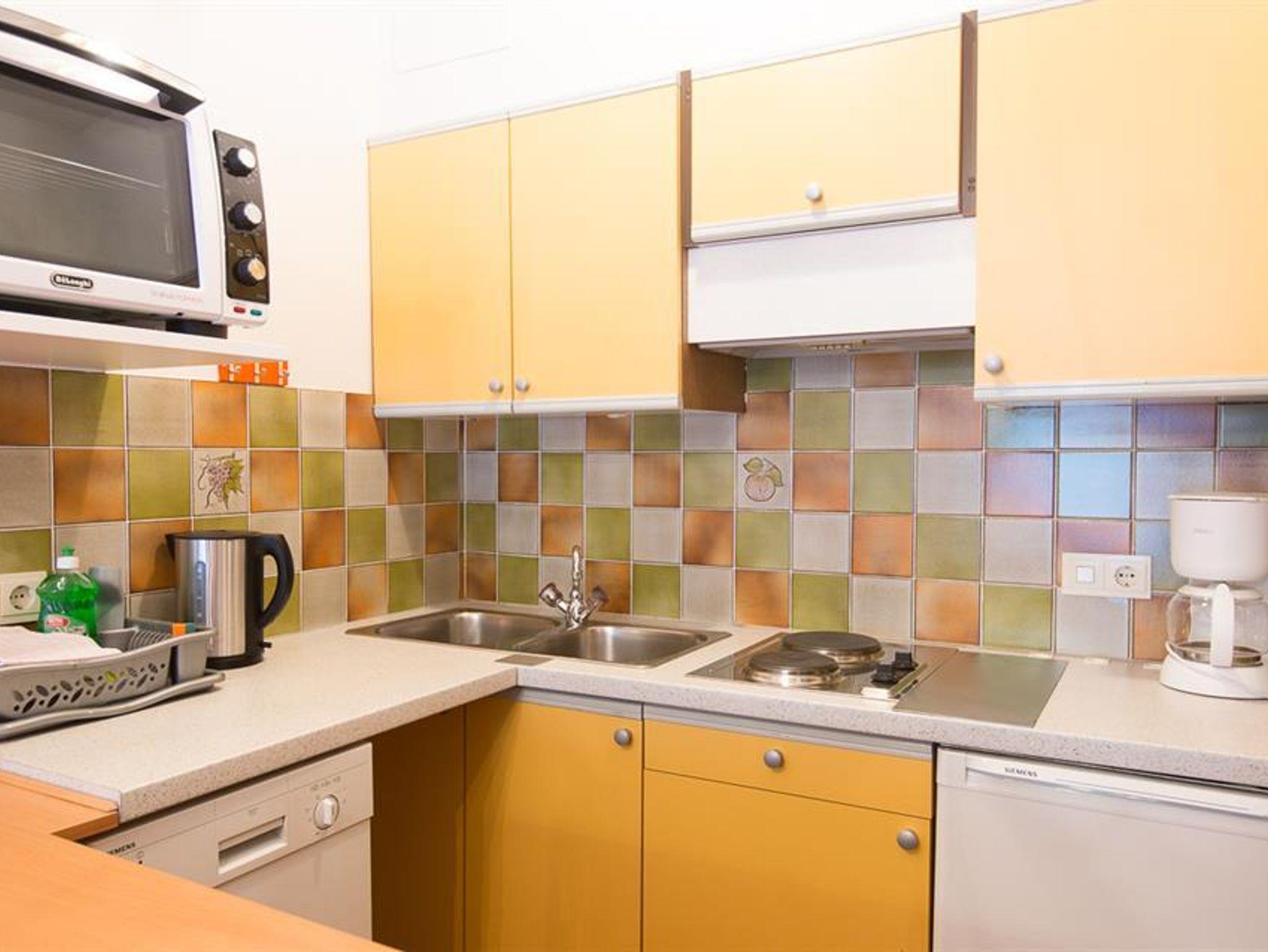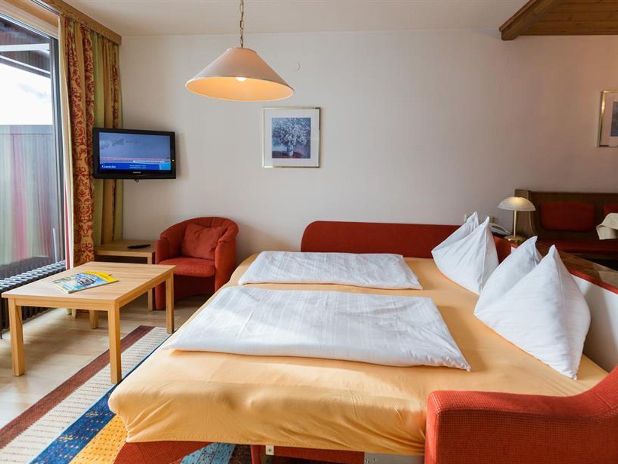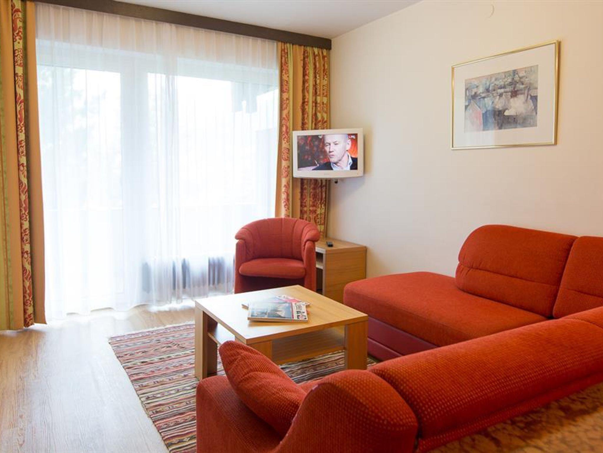 Typ A1 (40m²) Zweiraumwohnung mit großem Balkon oder Terrasse in Südlage, Schlafzimmer mit einem Einzelbett und einem Stockbett, Wohnraum mit gemütlichem Sofa (Einzelsofabett- oder Doppelsofabett), integrierte Küche mit 2 Plattenherd, Geschirrspüler, Kühlschrank (mit Gefierfach), Backrohr, Kaffeemaschine und Wasserkocher. Mikrowelle und Toaster auf Wunsch. Eßeckbank mit großem Tisch. Dusche und seperates WC, Haarföhn, Flat-TV mit internationalen Programmen, kostenloses Wlan, Safebox und Telefon.