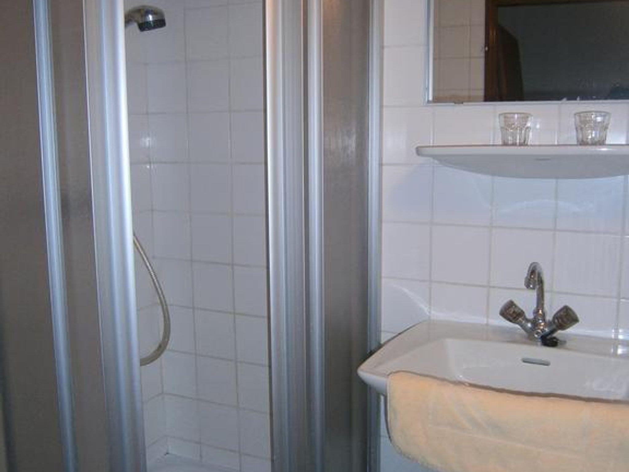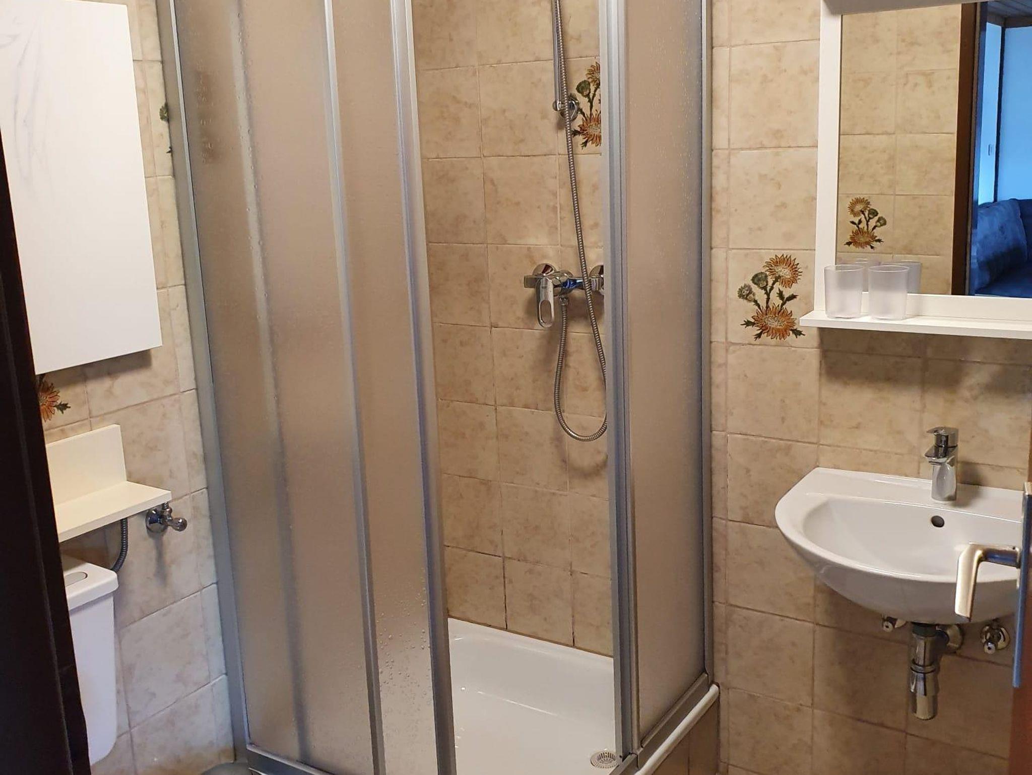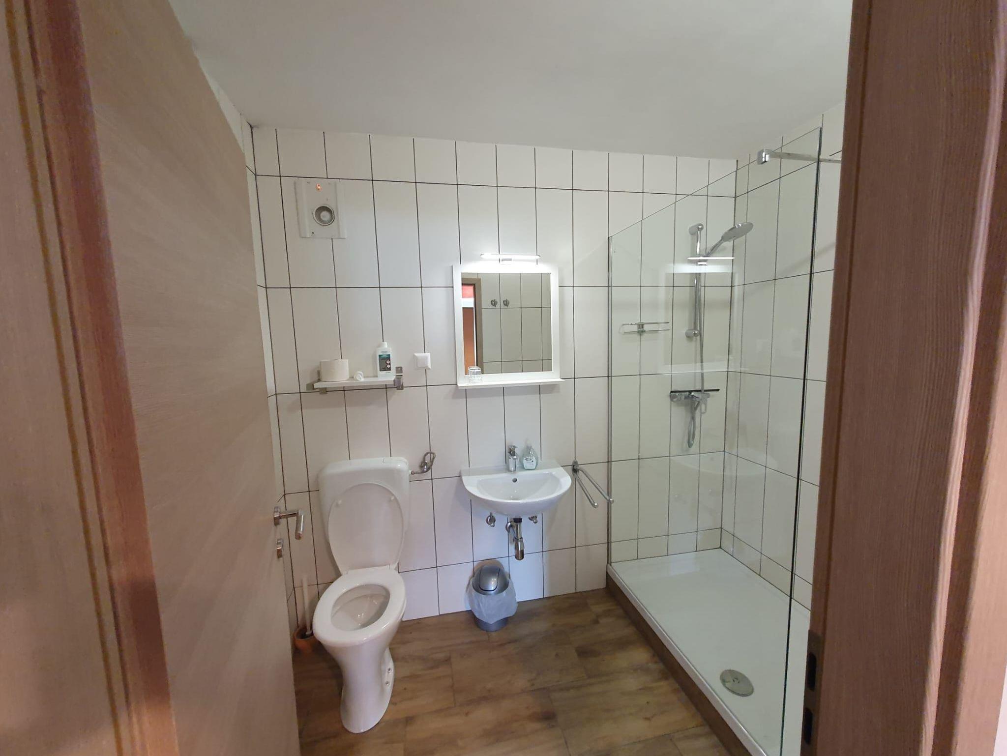 Bad (4 qm) ist mit einer Duche , Waschbecken und WC ausgestattet .