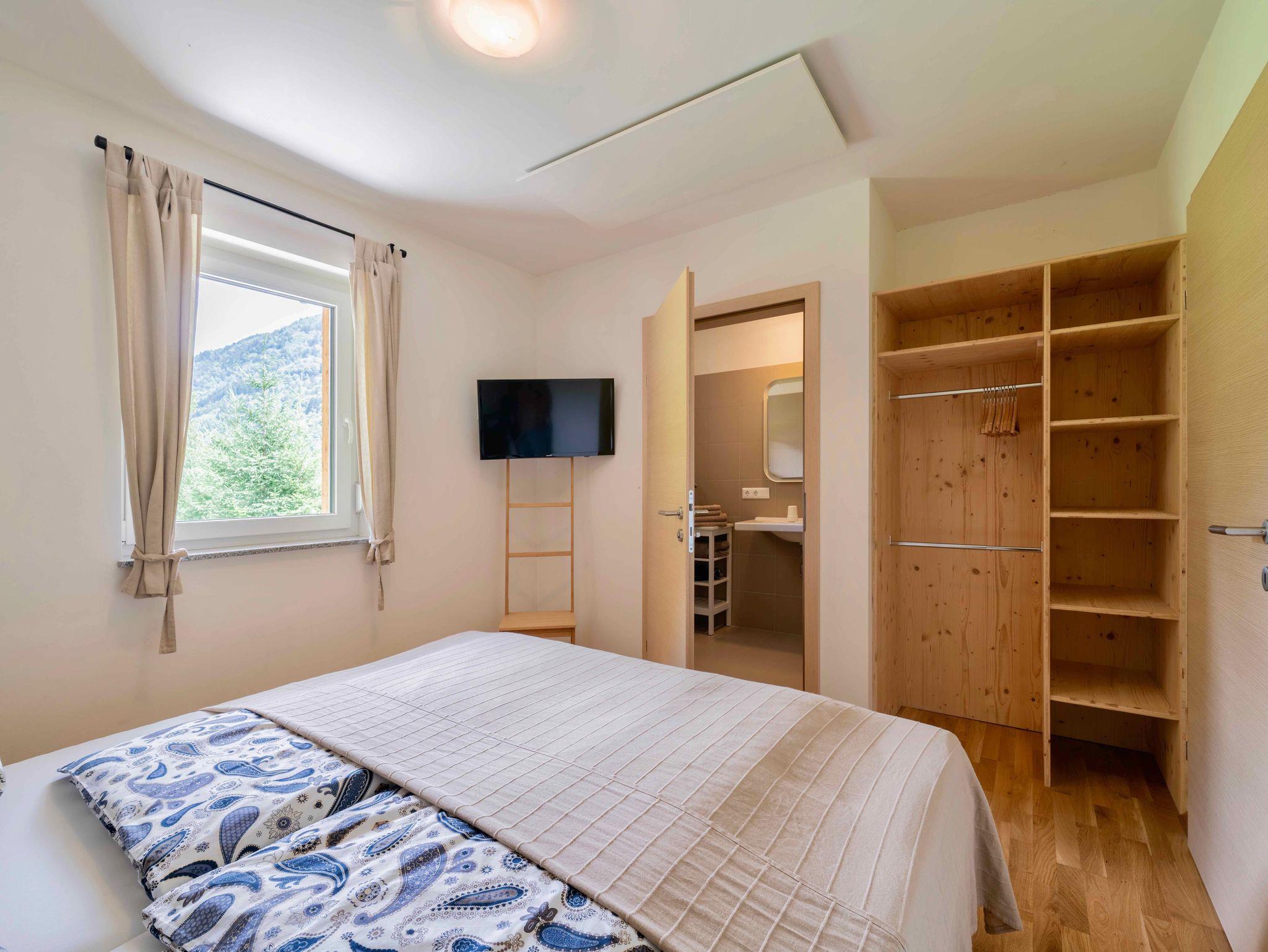 2 Schlafzimmer für 4 Personen mit jeweils eigenem WC/Badezimmer im OG. Die Wohnzimmercouch ist ebenfalls ein Doppelbett für weitere 2 Personen.