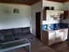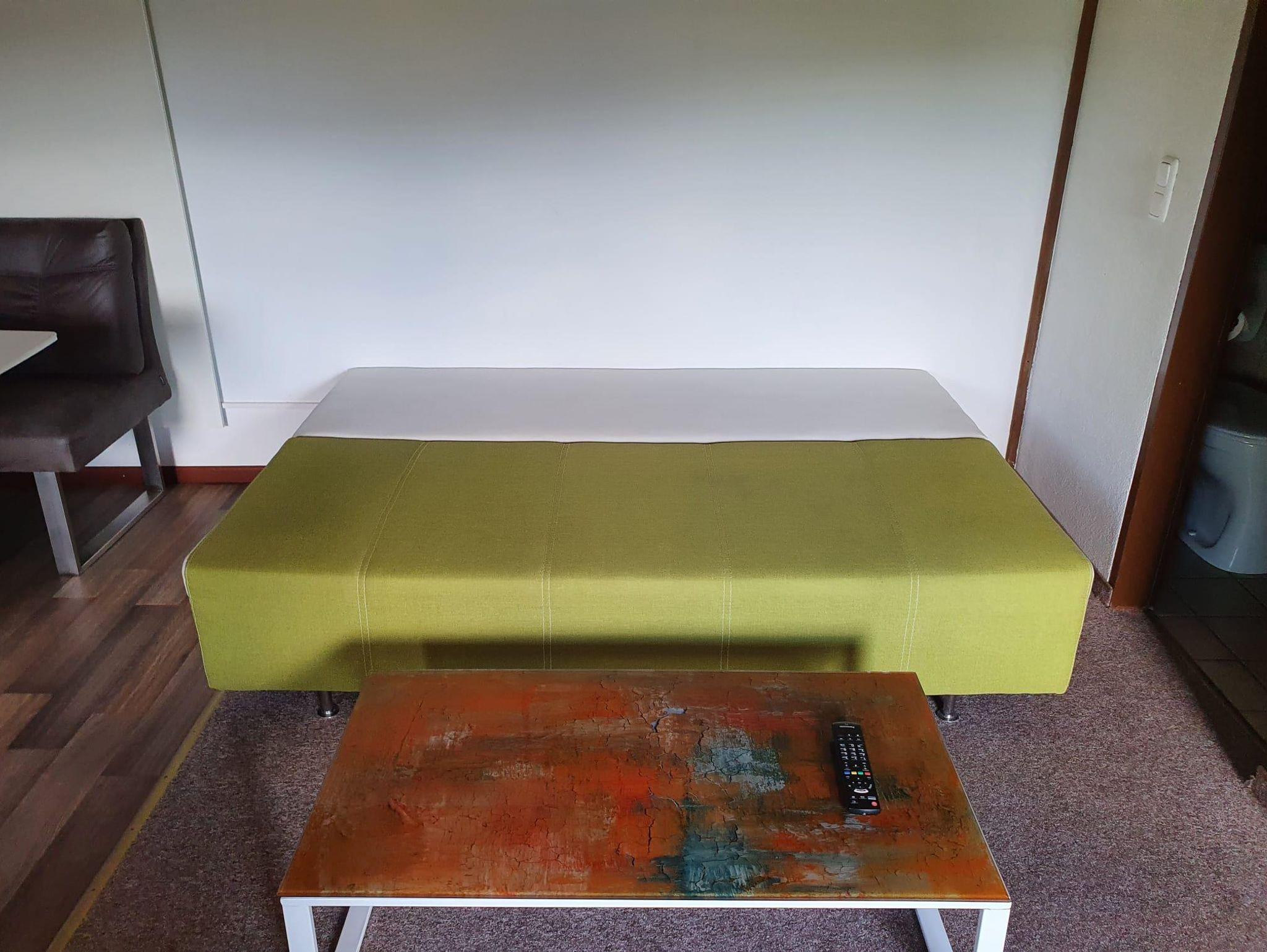Im Wohnzimmer ist eine Essecke und eine bequeme Schlafcouch (1,4m)