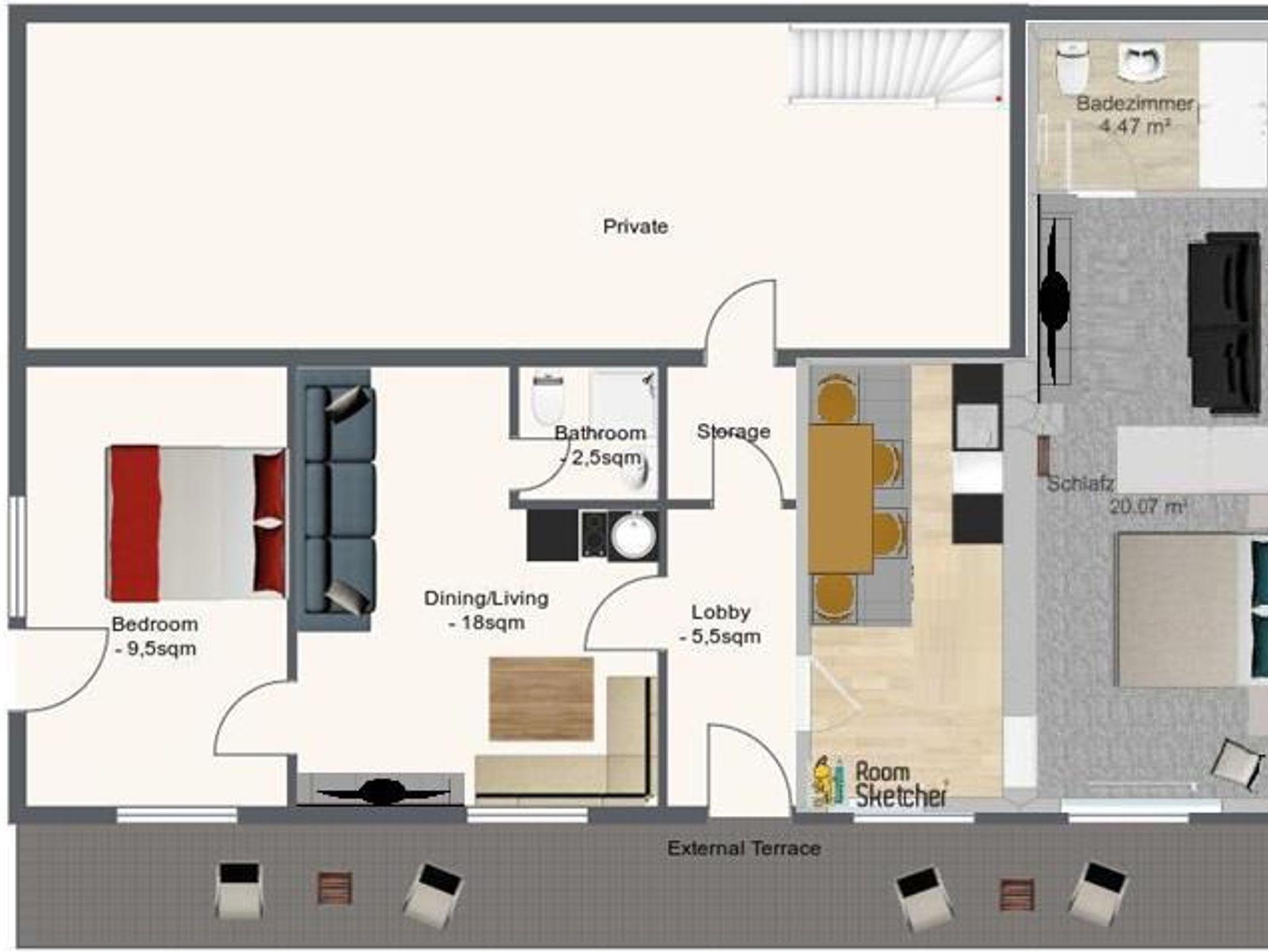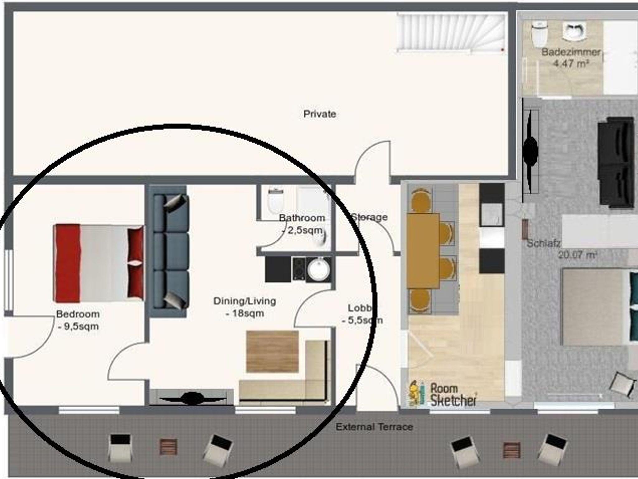 Das Apartment hat einen komplett eigenen Eingang abgeschottet von den anderen Apartments