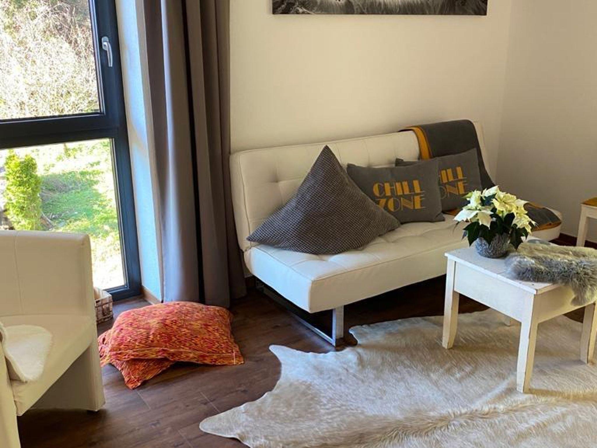 Große Wohnküche mit Couch (nicht ausziehbar!); 2 Schlafzimmer mit Boxspringbetten, eines davon mit Couch für 1 Person; beide Schlafzimmer sind mit TV ausgestattet.