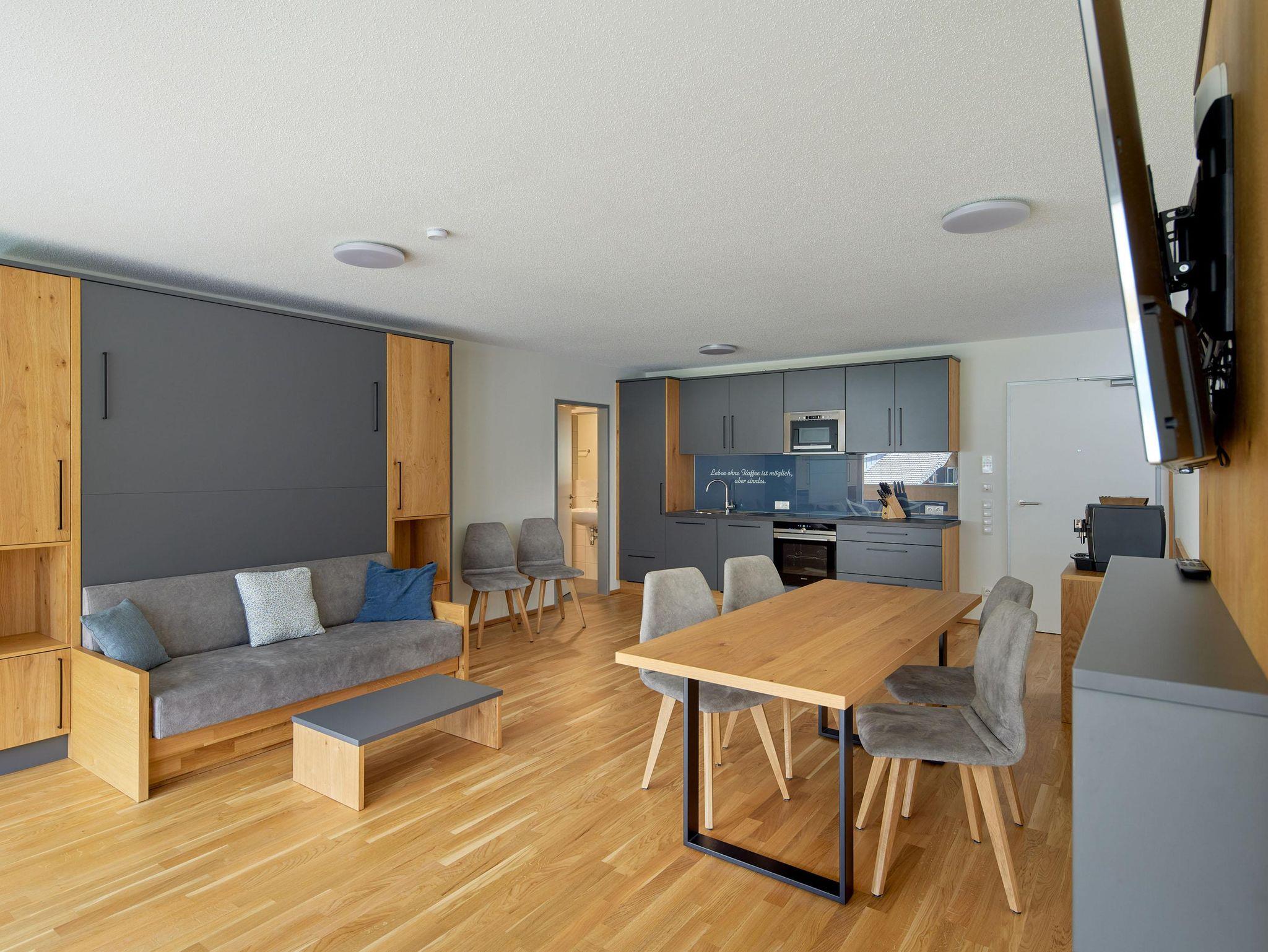Willkommen im Zapfig Living Apartment 13, Deinem perfekten Rückzugsort für einen erholsamen Aufenthalt. Die 80 m² Unterkunft im 1.Stock bietet ein gemütliches Wohnzimmer inkl. ausziehbaren Kingsizebett mit Smart-TV, 2 Schlafzimmer (Kingsizebett+ausziehbares Einzelbett+Smart-TV) sowie eine voll ausgestattete Küche. Die 2 Badezimmer verfügen über Dusche und WC. Genieße den Komfort einer eigenen Unterkunft+entspanne in alpiner Umgebung. Vom Balkon mit Liegenstühlen besteht Bergblick.