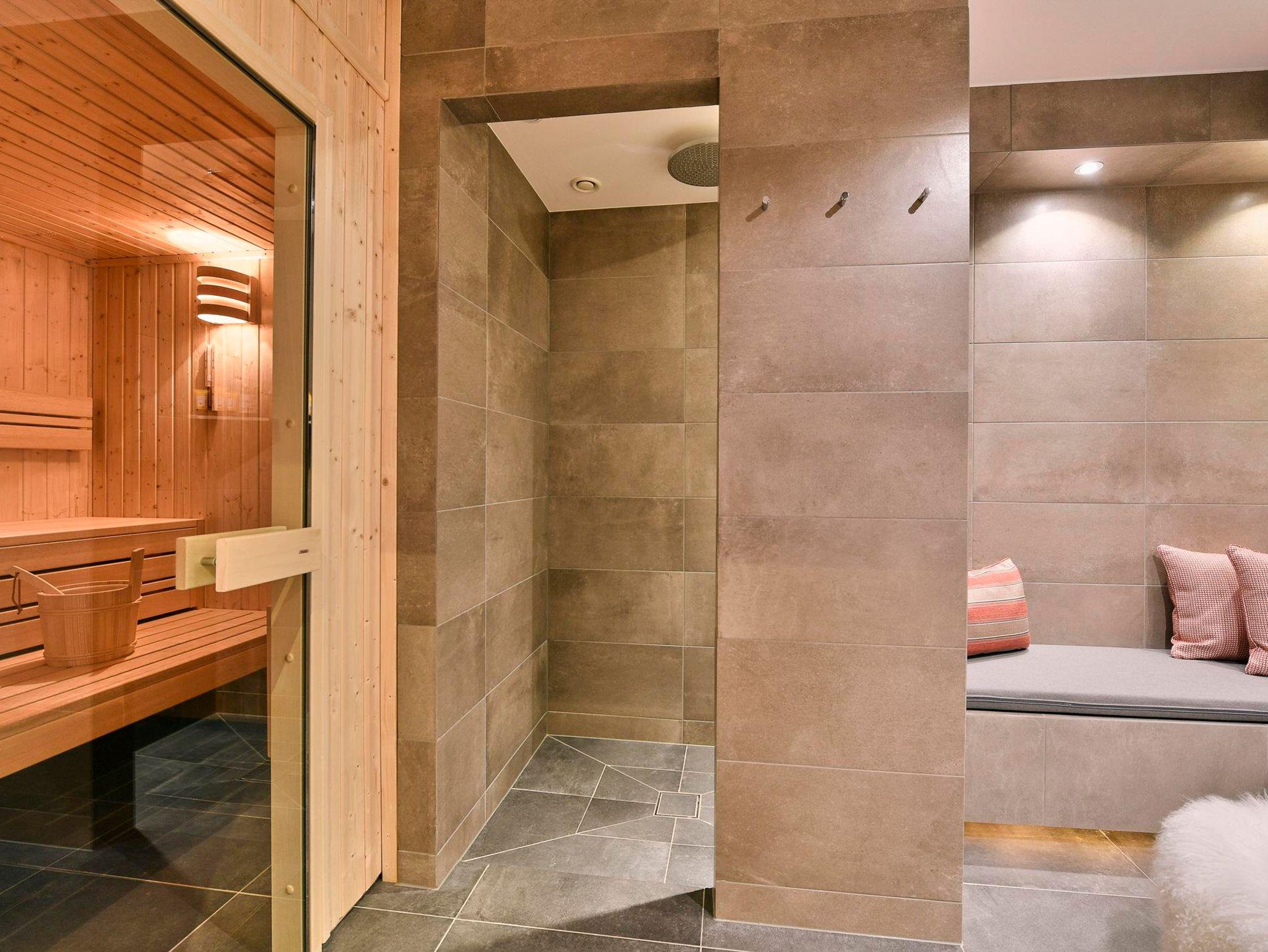 Luxuriöse Sauna mit begehbarer Dusche und Ruhebank