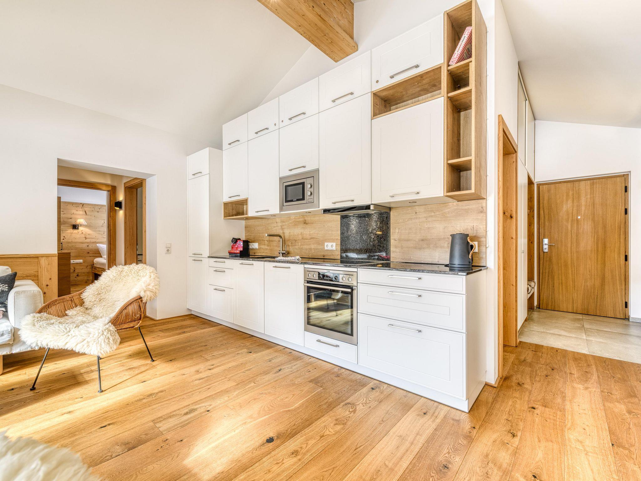 Alpenblick ist ein geräumiges und luxuriöses Apartment, das sich durch einen offenen Wohn-Essbereich mit sehr hohen Decken und einem unvergleichlichen Blick auf das Klostertal auszeichnet.