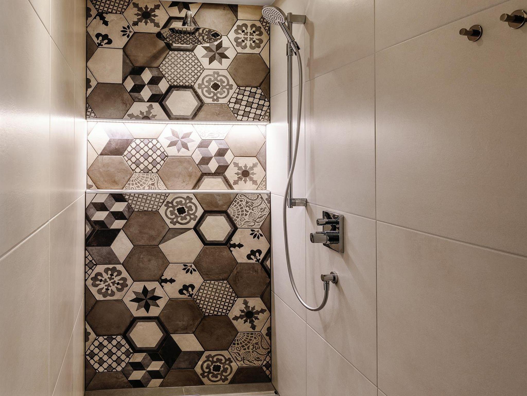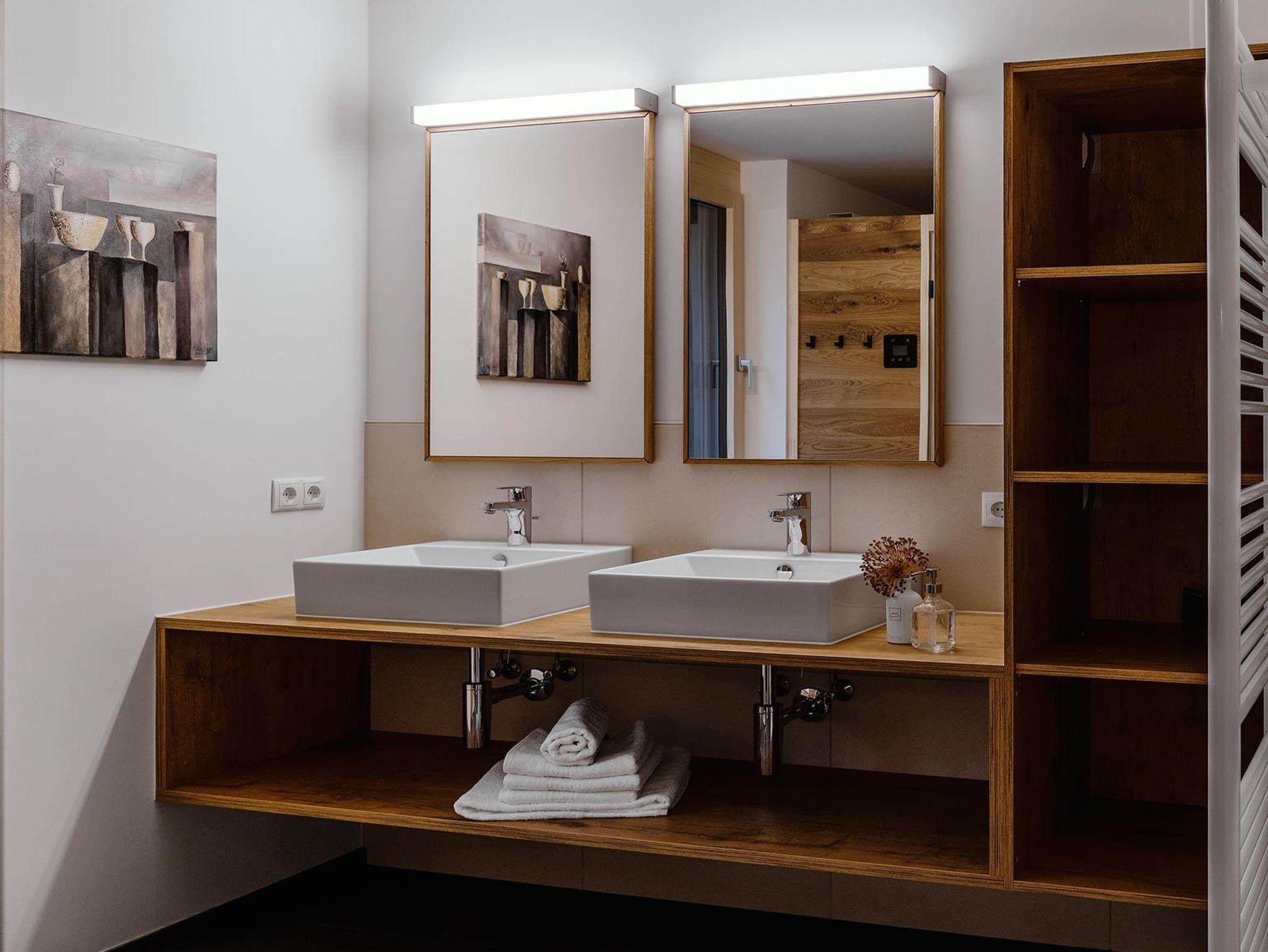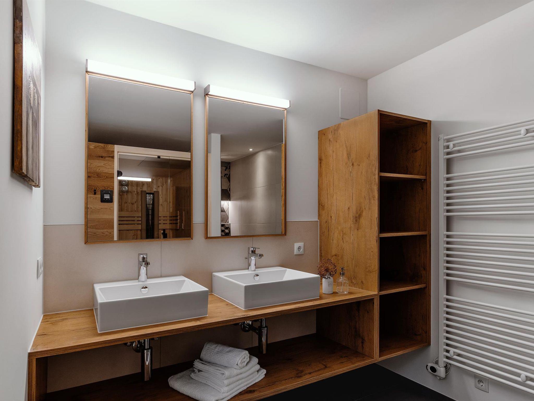 • 1 großes Badezimmer mit SAUNA, Infrarotstrahler, Doppelwaschbecken und Wellnessdusche