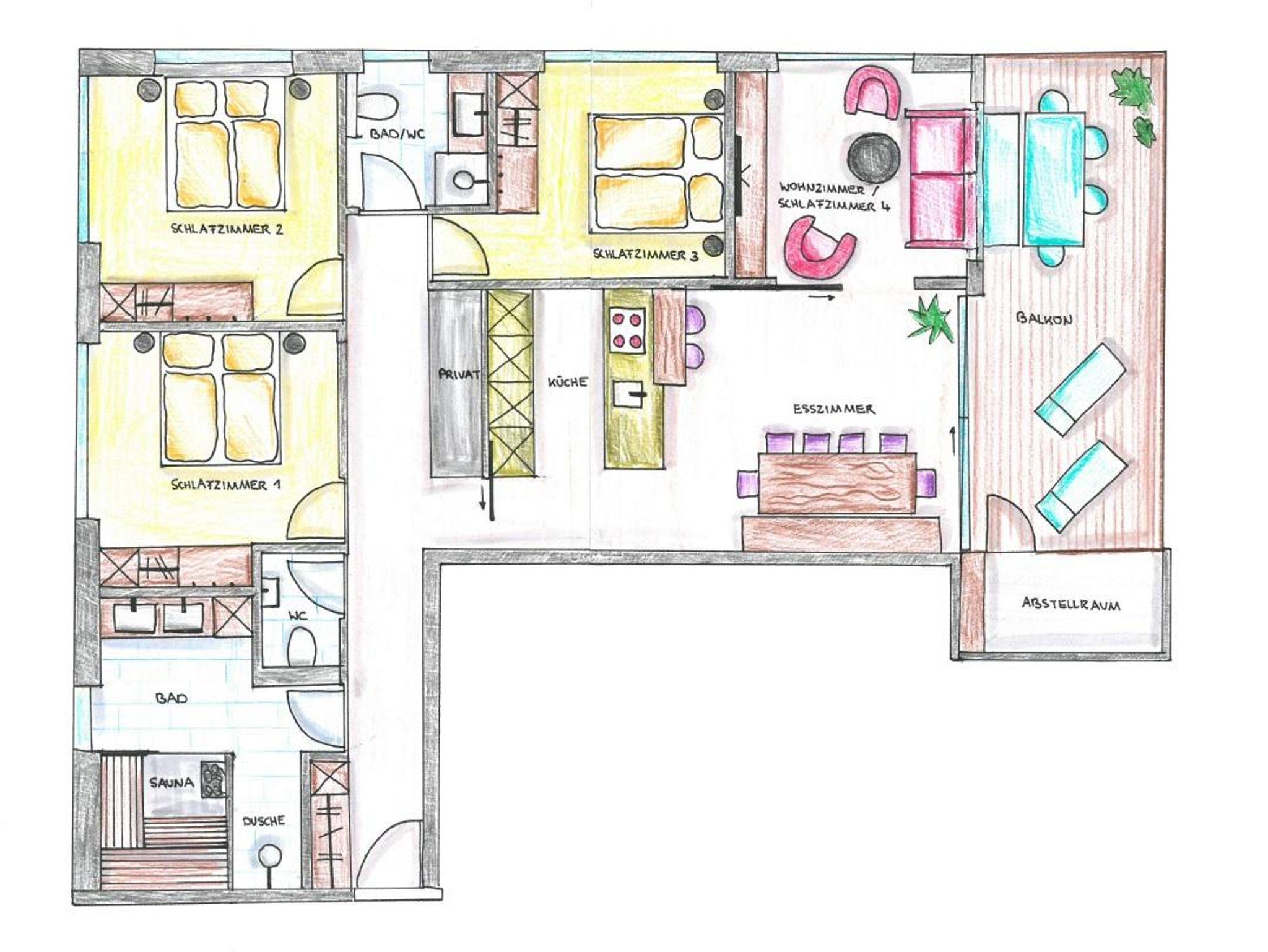 Unser barrierefreies Apartment bietet Platz für bis zu 8 Personen. Neben zwei Badezimmern, finnischer Sauna mit Infrarotstrahler und einer vollausgestatteten Küche, lädt der große Wohn-Essbereich zum gemütlichen Beisammensein ein.