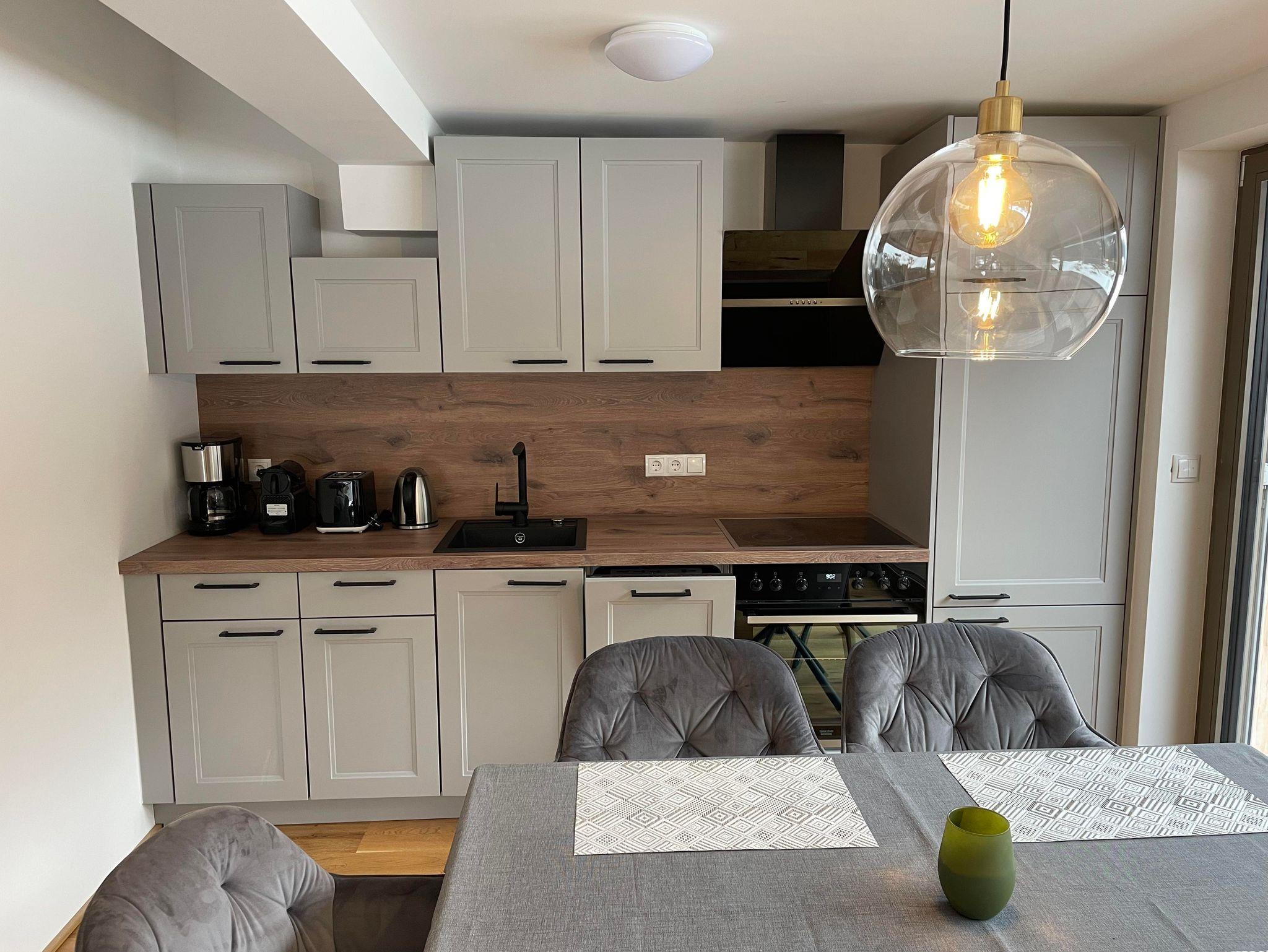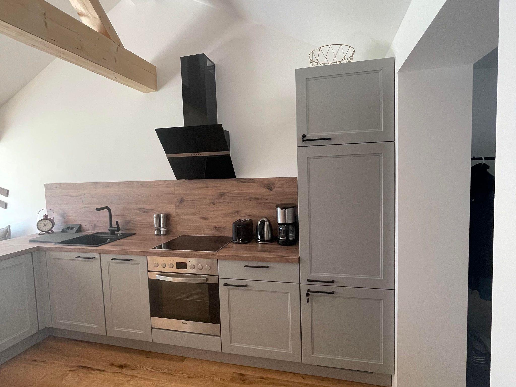 Die offene Küche ist komplett ausgstattet und verfügt über einen Backofen mit Induktionsherd, Filter-Kaffeemaschine (Filter Nr. 4), Wasserkocher, Toaster und Kühlschrank mit Gefrierfach.