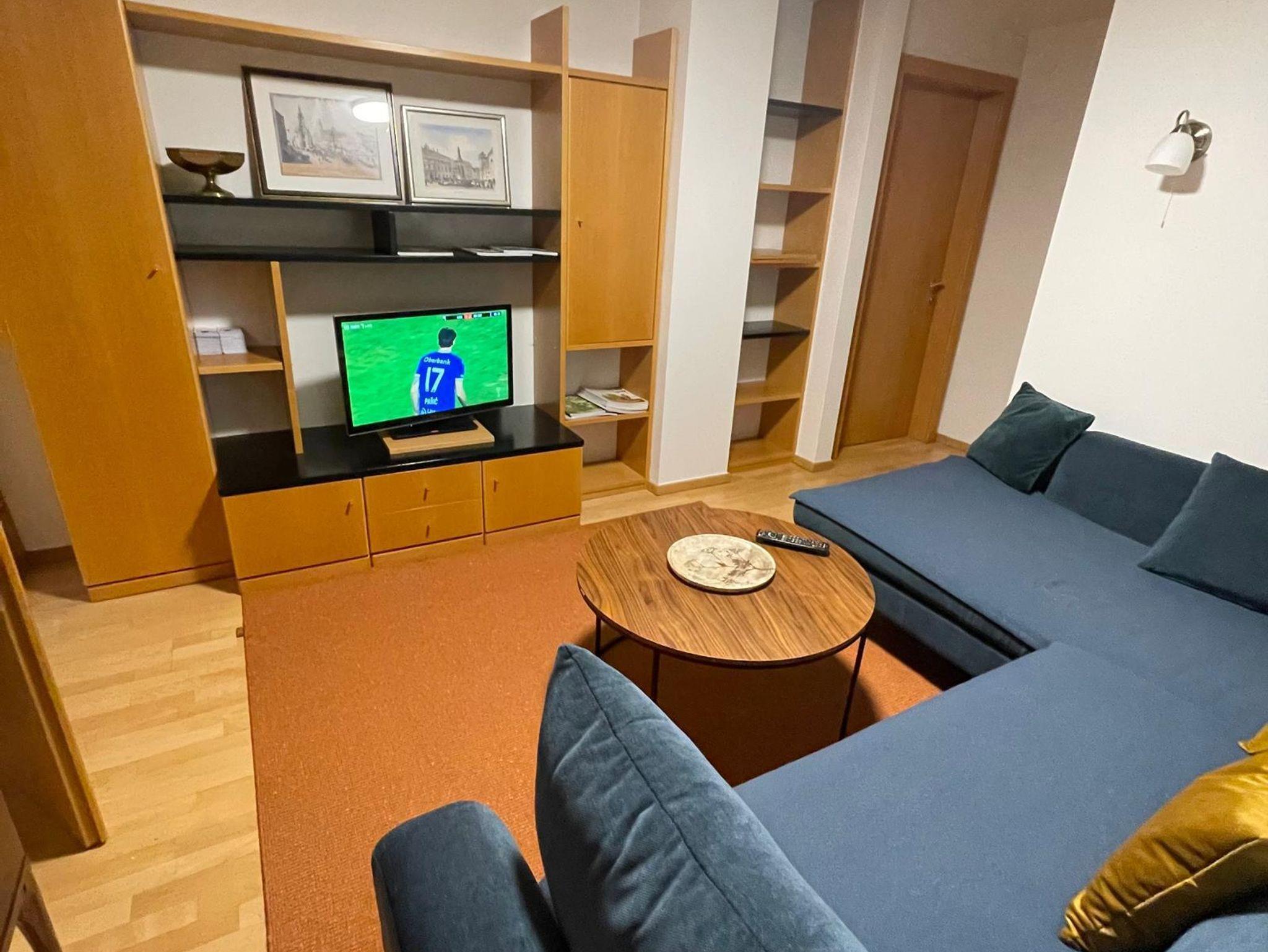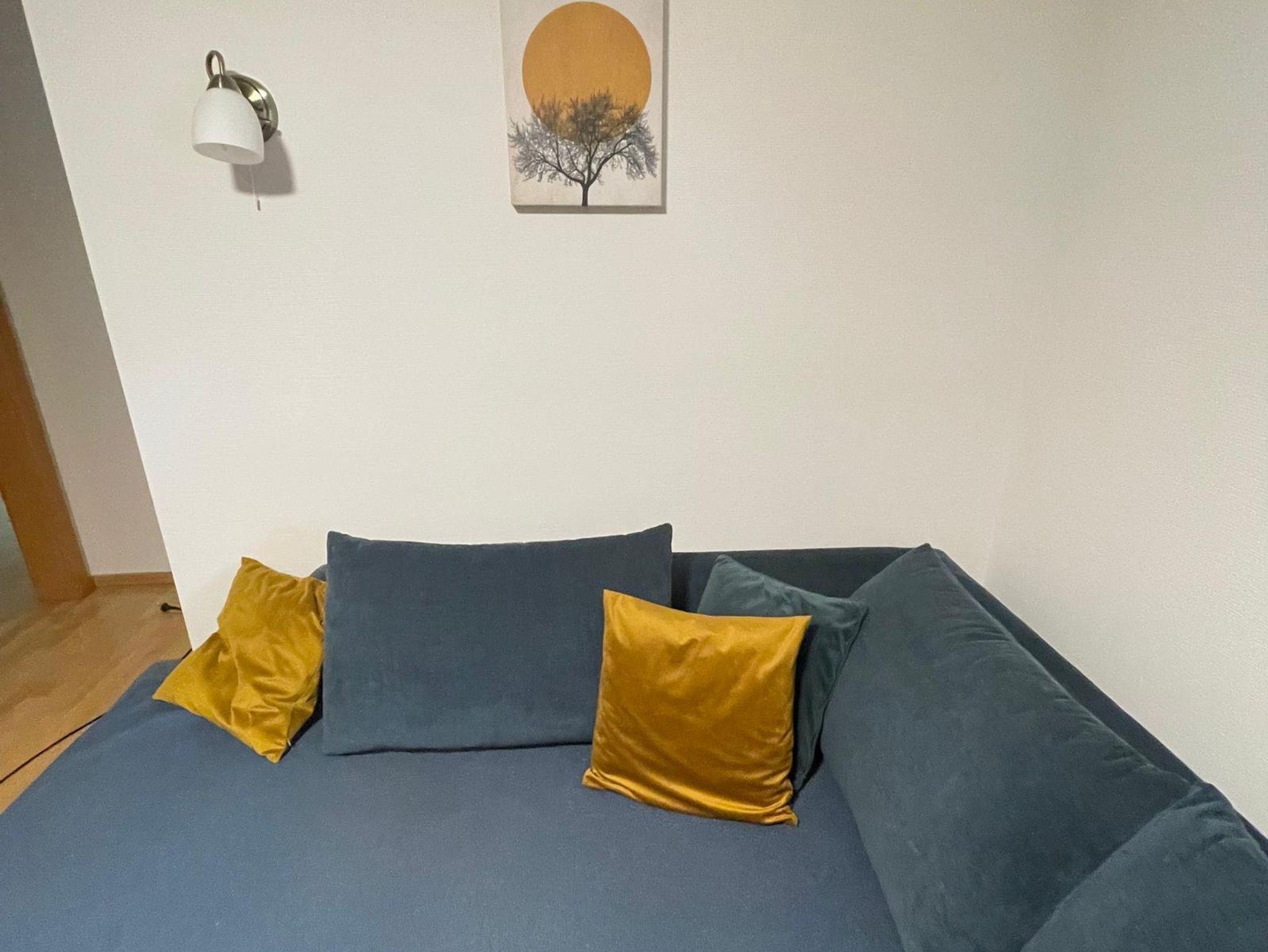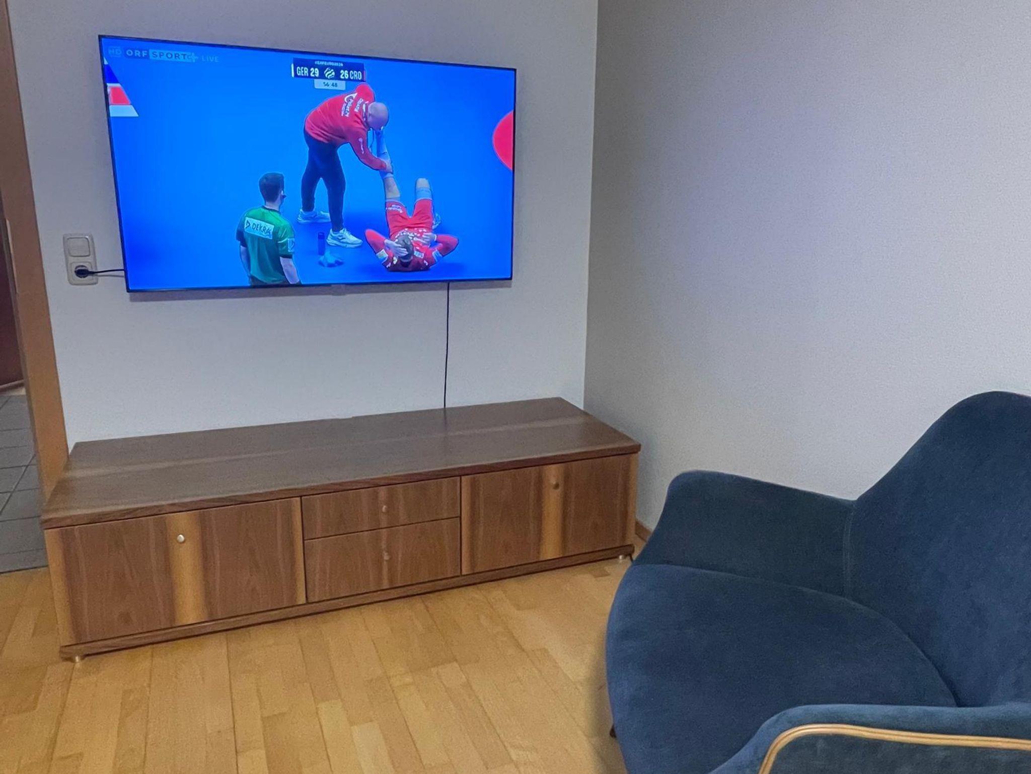 Wohnzimmer 14 m² mit Wohnwand, TV, große Couch, Sessel und Kommode