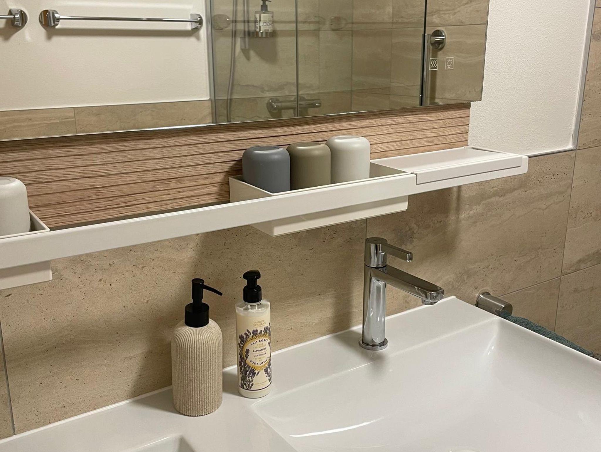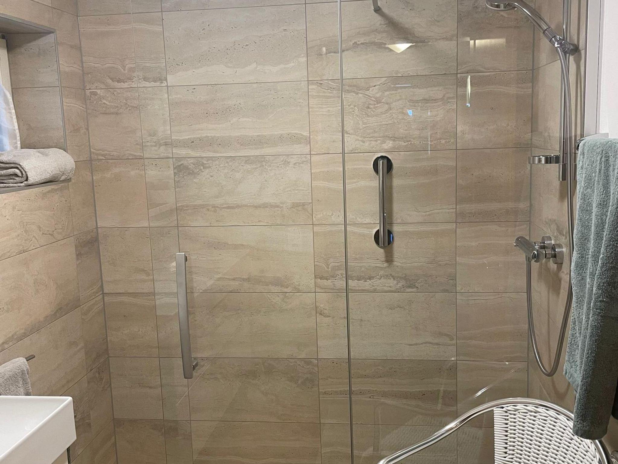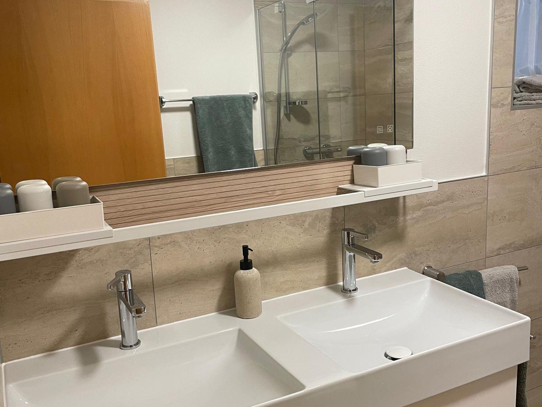 Badezimmer: 5 m² mit Doppelwaschbecken, begehbarer Dusche (keine Badewanne), Stuhl