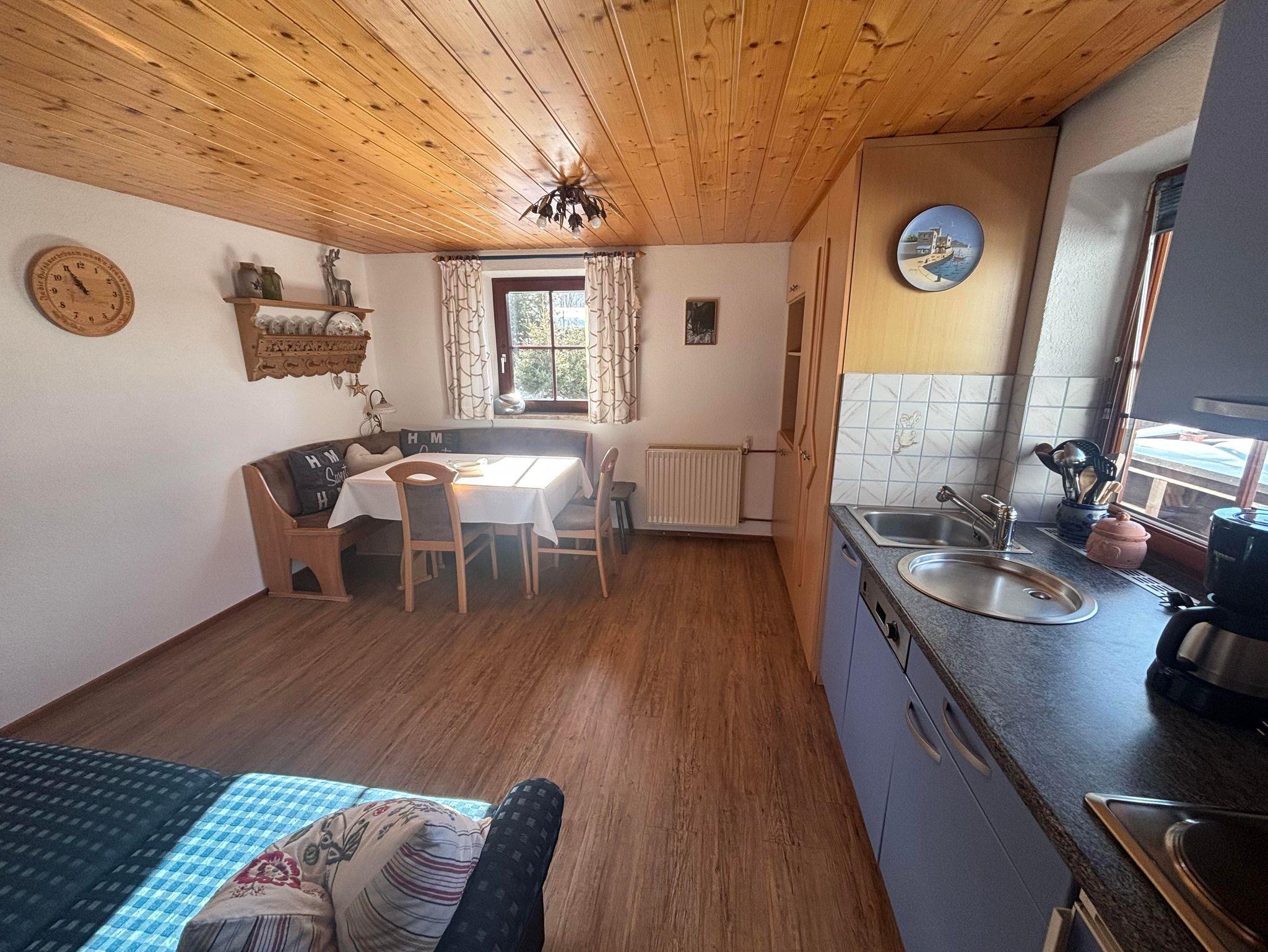 Ferienwohnung mit einem Schlafzimmer (Dreibettzimmer), Dusche/WC, Wohn-Küche mit Ausziehcouch, große Eßecke, Geschirrspüler, E-Herd, Kühlschrank mit Gefrierfach, Kaffeemaschine, Wasserkocher, Radio, Kabel-TV, W-LAN und möblierter Sonnenbalkon.