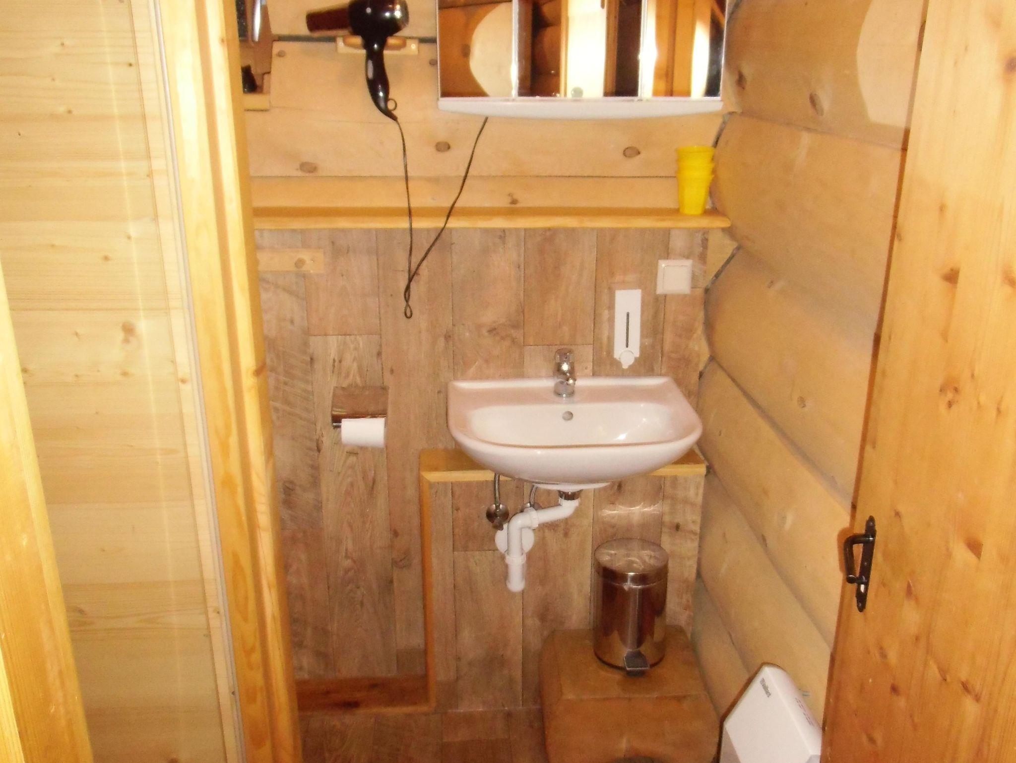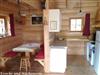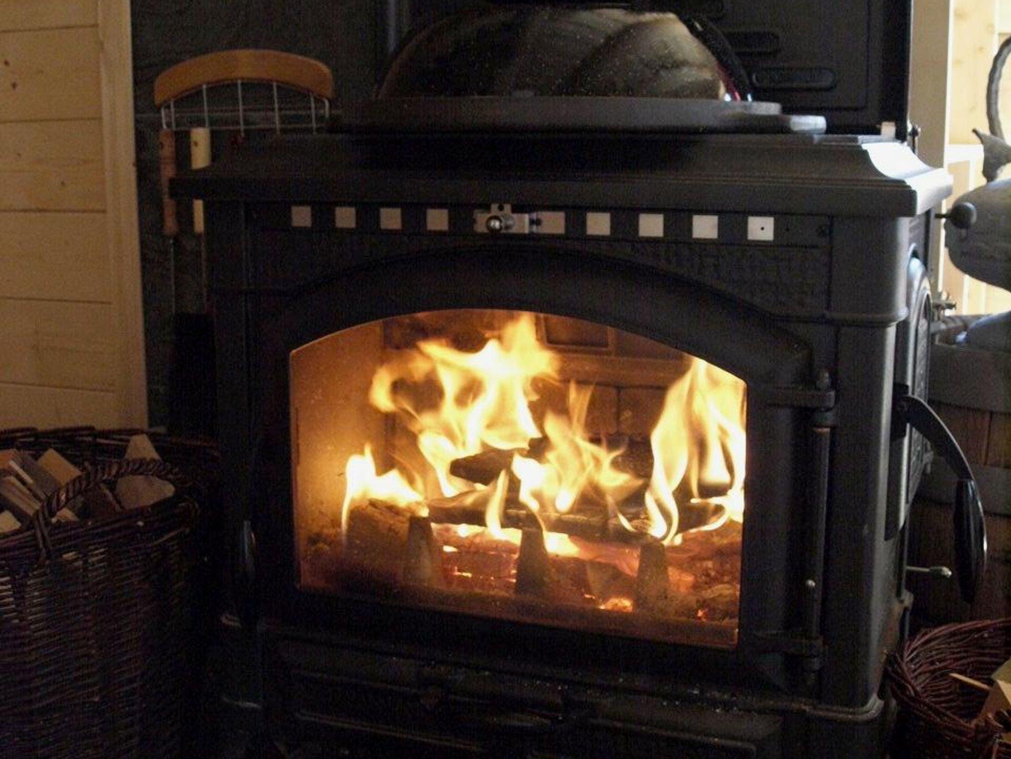 Das Ferienhaus ist komplett aus Holz gebaut. Die einzigen Steine sind für den Kamin und den Brandschutz am Kaminofen verbaut.