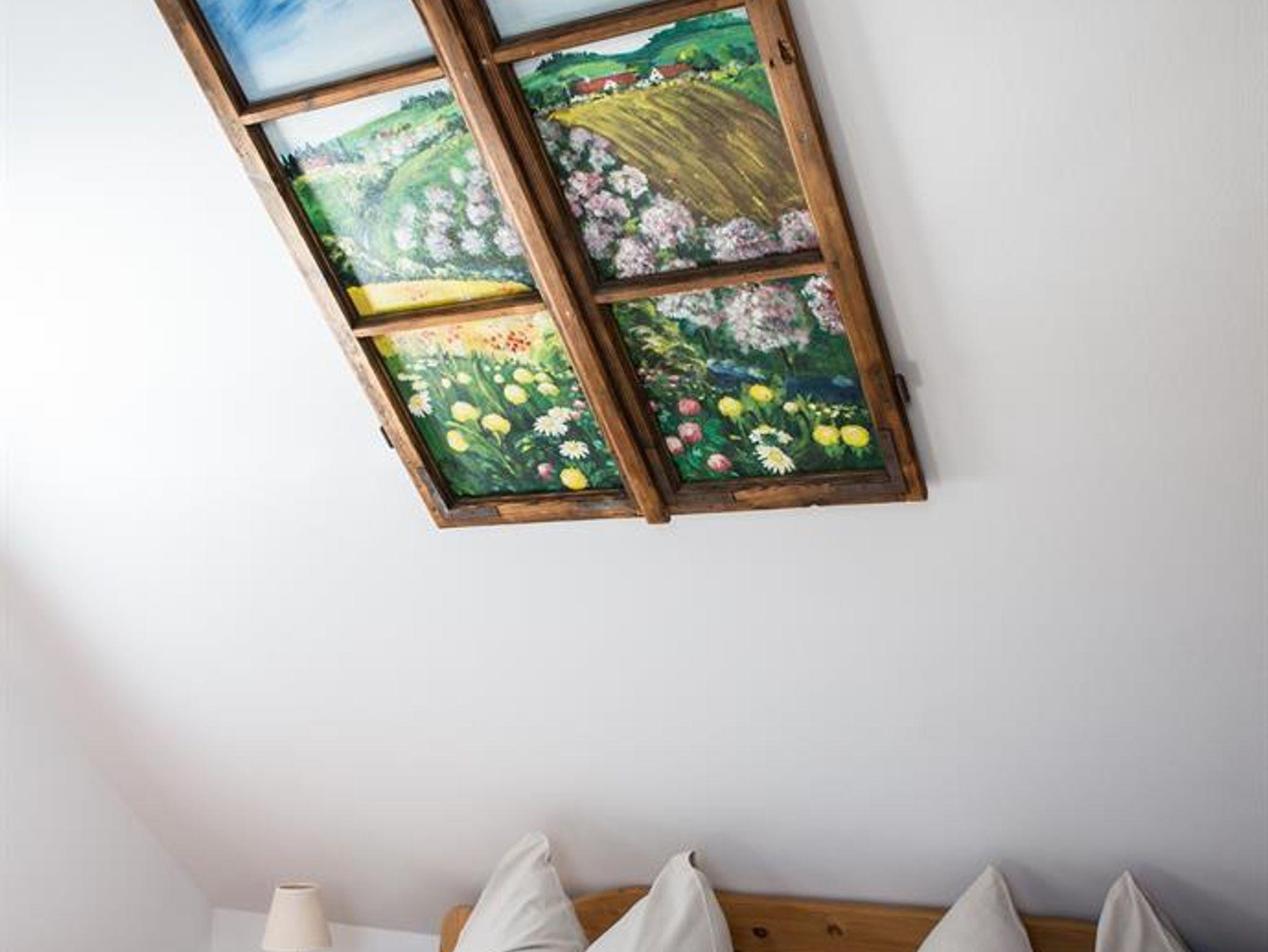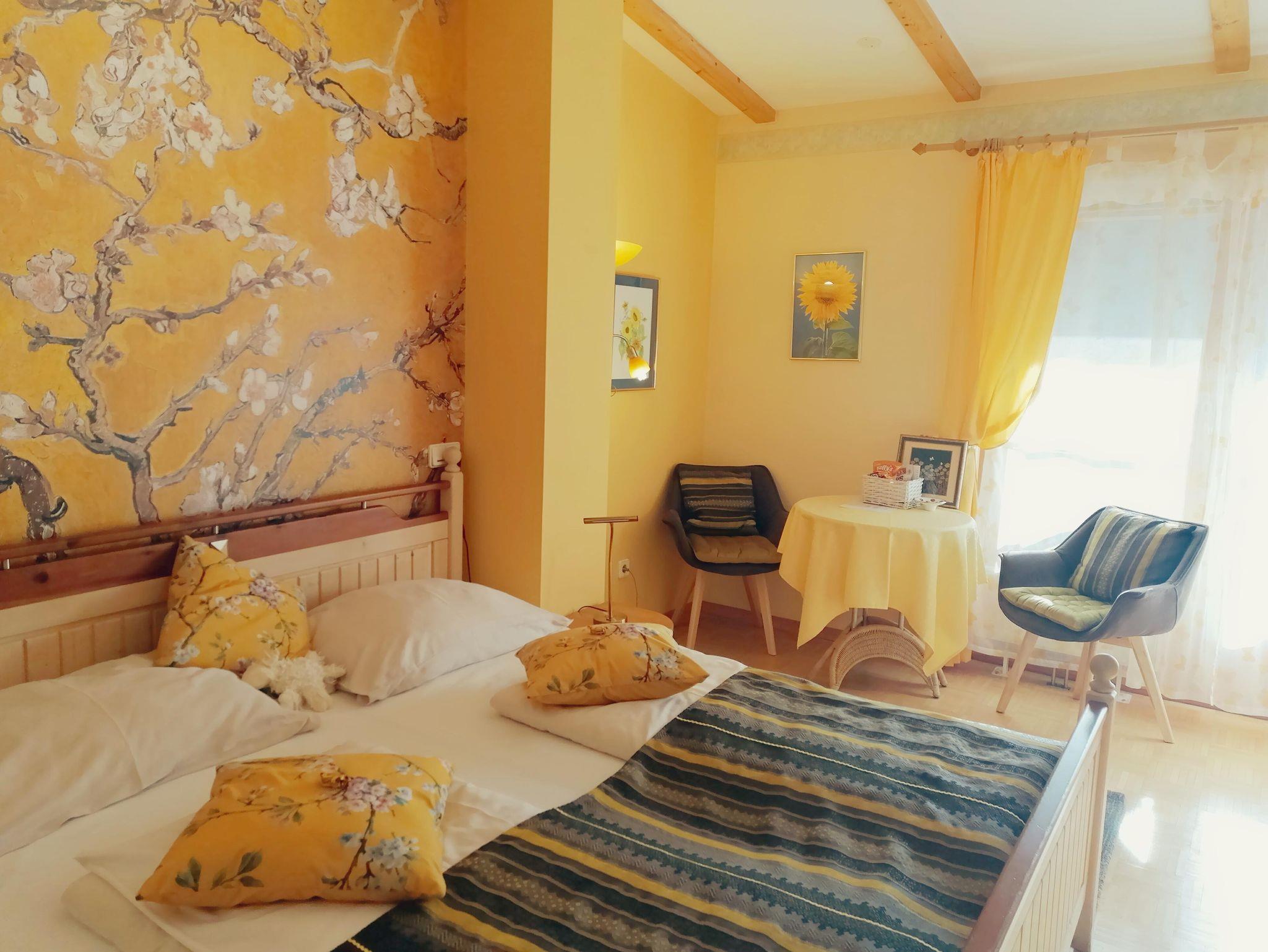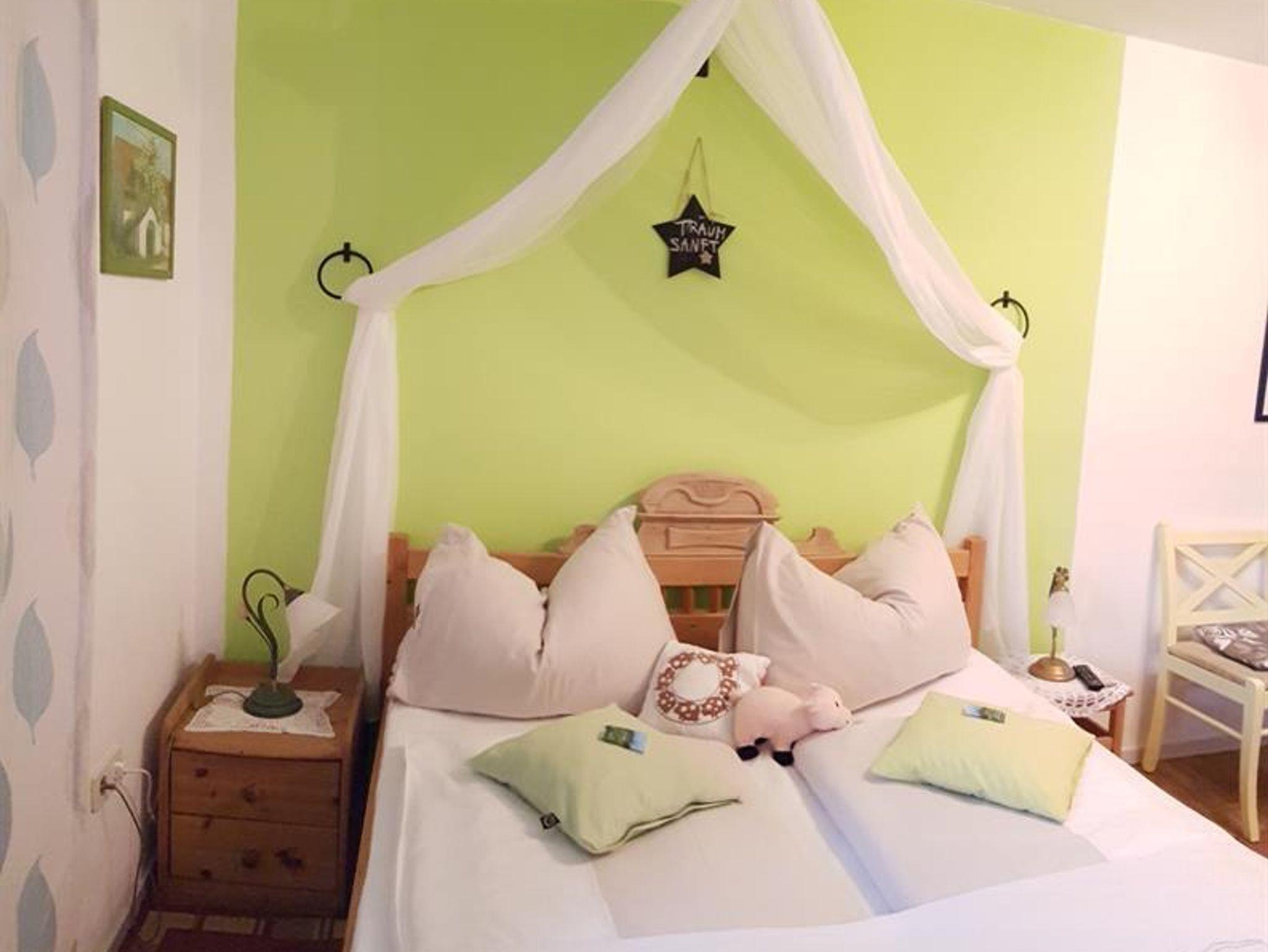 FamilienZimmer ( 1-4 Pers.) Individuell ausgestattet und liebevoll gestaltet, mit Doppelbett und DoppelHochbett oder ausziehbarer Doppelcouch, großteils mit Balkon bzw. Terrasse, Gartenblick, GrünRuhelage