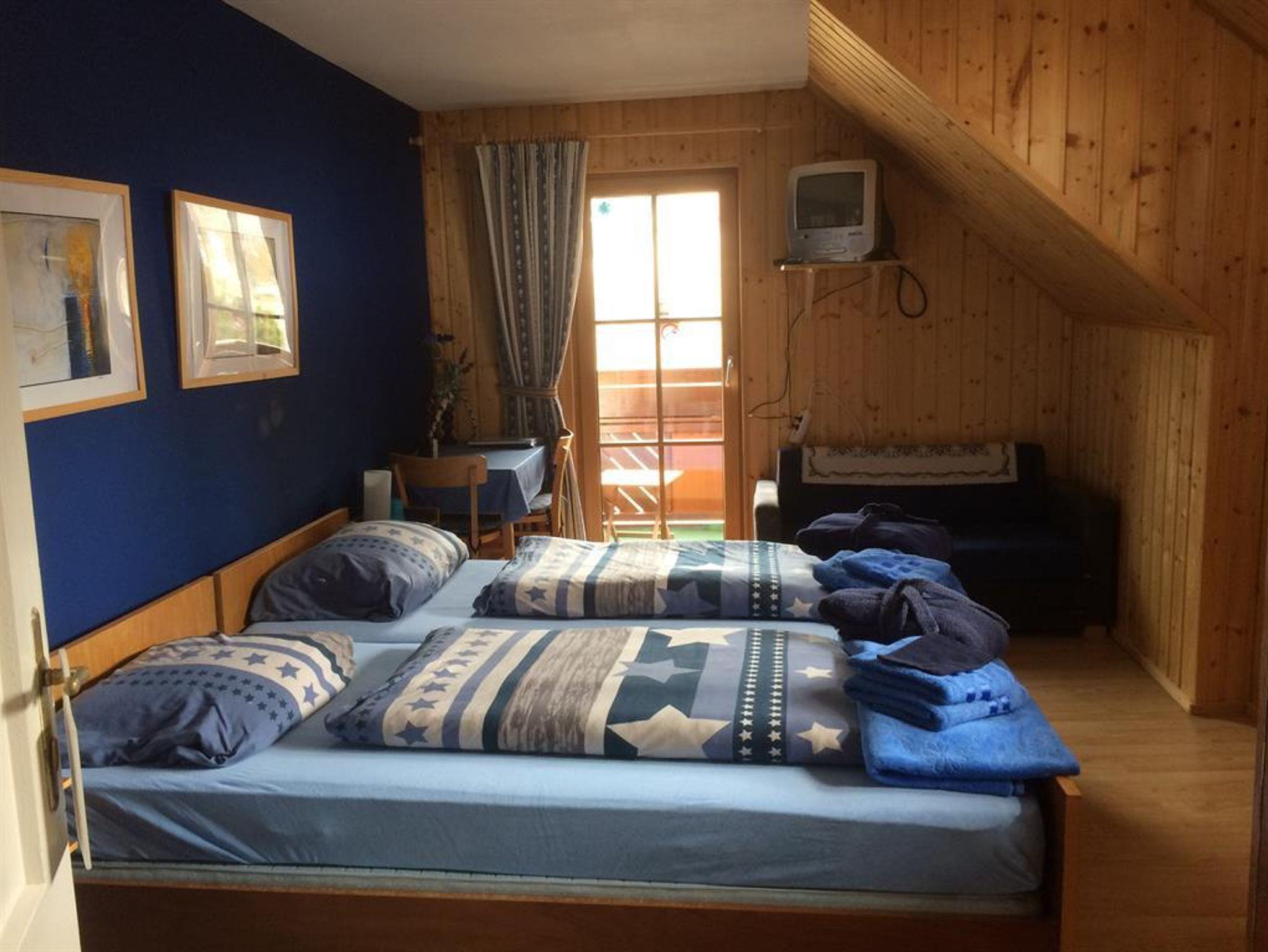 Doppelzimmer Enzian: Doppelbett, Waschtisch, Balkon, mit Möglichkeit für 3. Person. Helles Zimmer mit herrlichem Blick auf den Brennsee, Balkonmöbel. Kinderermäßigung nur möglich bei Belegung von mindestens 1 Erwachsenem. Gratis- Benützung der Gästeküche in ersten Stock.