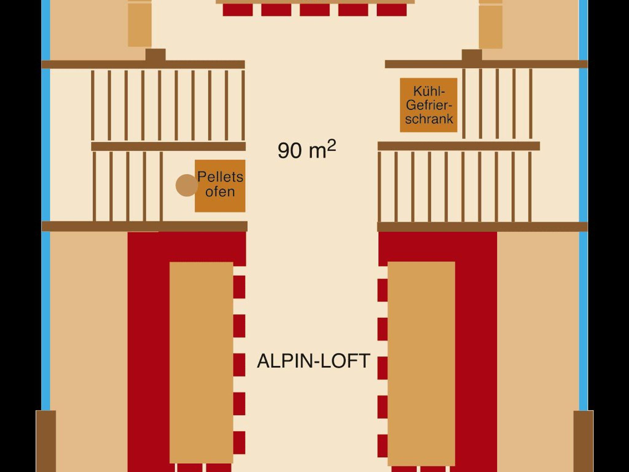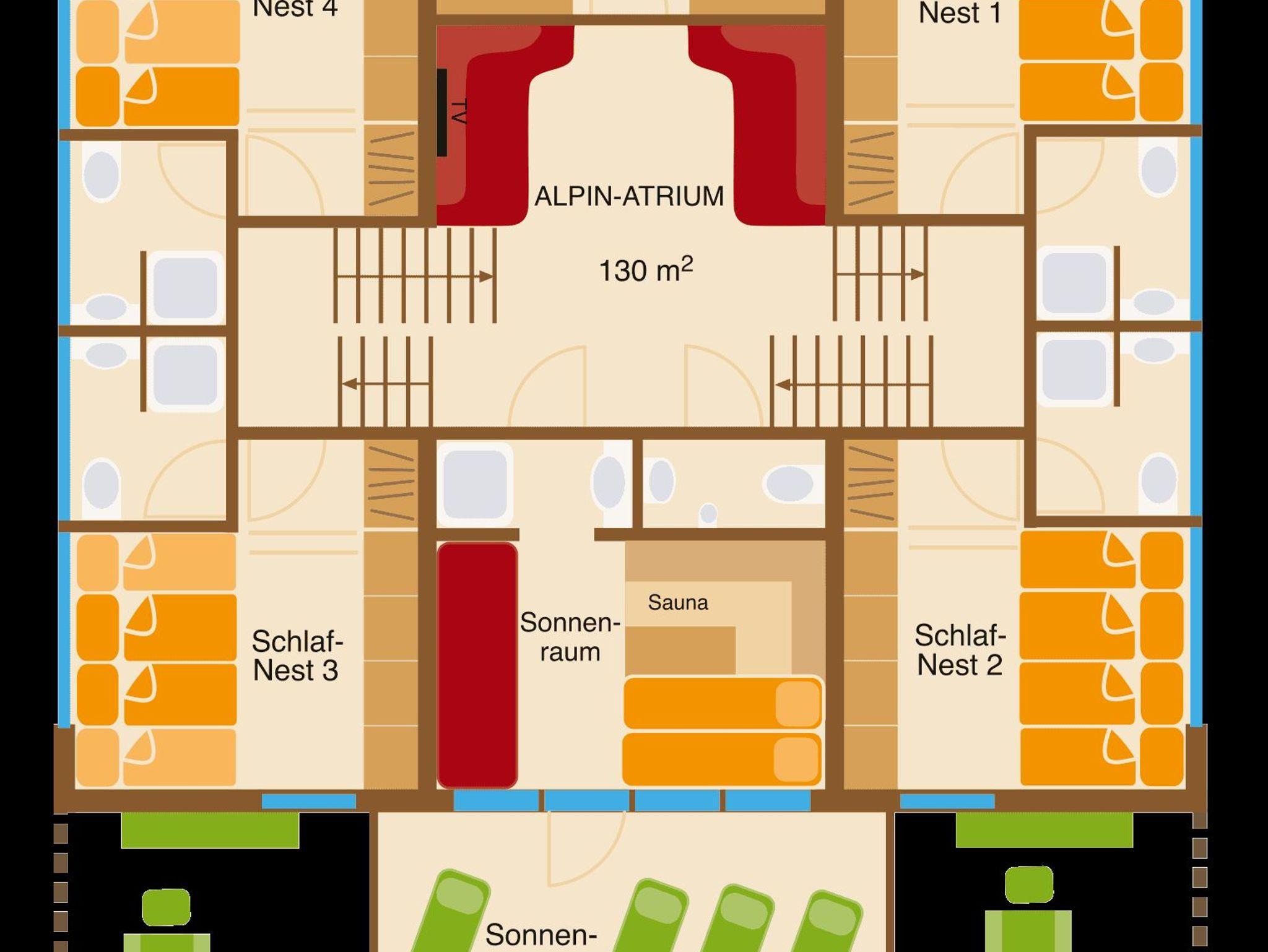 220m2, Alpin Loft mit Küche, Alpin Atrium, 4 Schlafnester mit Dusche/WC, Sonnenraum mit Sauna und Doppelbett. Basismietpreis bei Belegung bis 12 Personen, Maximalbelegung 18 Personen mit Extrazimmer bis 24 Personen. Die Küche ist großzügig mit Porzellan, Gläsern und Besteck für 24 Personen ausgestattet. Hobbyköche finden alles gängigen Küchengeräte und eine breite Palette an Pfannen und Töpfen.