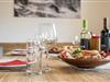 Die moderne Küchenzeile lässt auch bei Profi-Köchen keine Wünsche offen. Neben einem Induktions-Kochfeld gibt es einen Backofen, einen Kühl- und Gefrierschrank sowie allerhand elektrische Küchengeräte (Kaffeemaschine, Toaster und Wasserkocher). Der große Esstisch bietet allen Gästen ausreichend Platz. Aus dem Wohnbereich gelangt man auf die möblierte Terrasse, welche einen traumhaften Ausblick auf die umliegende Bergwelt bietet.
