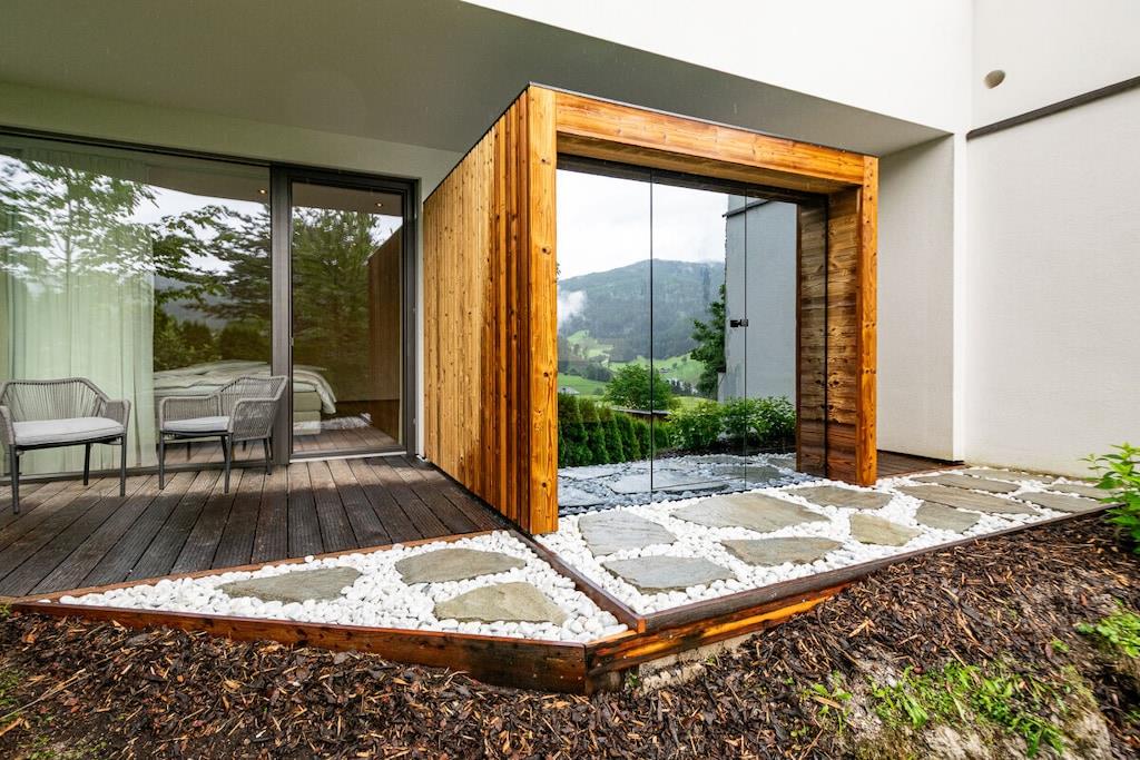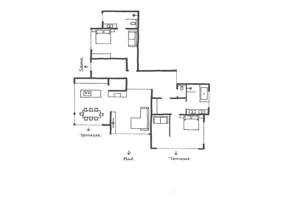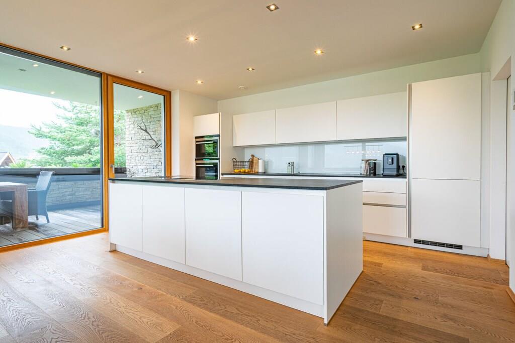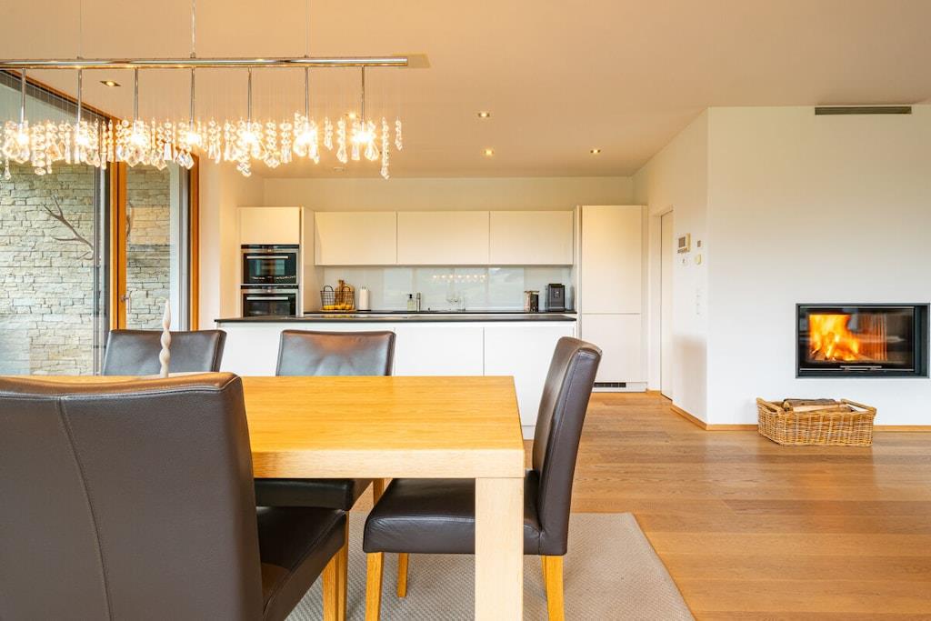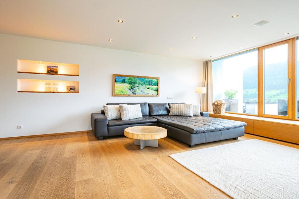 Exklusive Ferienwohnung mit 160 m². In einem großen Wohnbereich mit einladender offener Küche, einem großen Tisch und einem gemütlichen Wohnzimmer mit Kaminofen fühlt man sich sofort wohl und geborgen. Der herrliche Blick auf die Berge schafft ein Gefühl von Weite und Freiheit. Die beiden großen Zimmer sind geschmackvoll eingerichtet, jedes mit einem komfortablen Doppelbett und einem Doppelschlafsofa, welches zusätzlichen Platz für Familie und Freunde bietet. Jedes der Zimmer verfügt über ein separates Badezimmer. Eine private Außensauna und ein saisonales Pool stehen zur Verfügung.