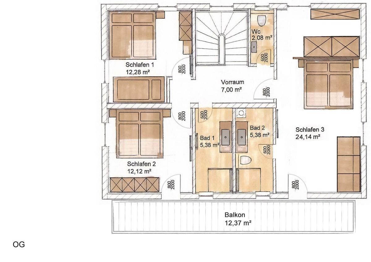 Im Obergeschoss befinden sich die Schlafzimmer. Diese sind aufgeteilt in einen großzügigen Master-Bedroom mit Badezimmer en-Suite (Dusche, Toilette, Waschbecken), begehbarem Kleiderschrank, Couch (bei Bedarf zwei weitere Schlafplätze), Flatscreen-TV, ein privater Balkon und Zugang zum großen Balkon mit bodentiefen Fenstern und Bergpanorama. Die weiteren Schlafzimmer unterteilen sich in ein gemütliches Doppelbettzimmer mit Zugang zum Balkon und ein Vierbettzimmer mit einem Hochbett und einem Doppelbett. Alle Doppelbetten sind hochwertige Boxspringbetten, welche einen erholsamen Schlaf garantieren. Alle Schlafzimmer verfügen über ein Flatscreen-TV. Im Obergeschoss befindet sich zudem ein weiteres Badezimmer mit Dusche und Waschtisch sowie eine räumlich getrennte Toilette.