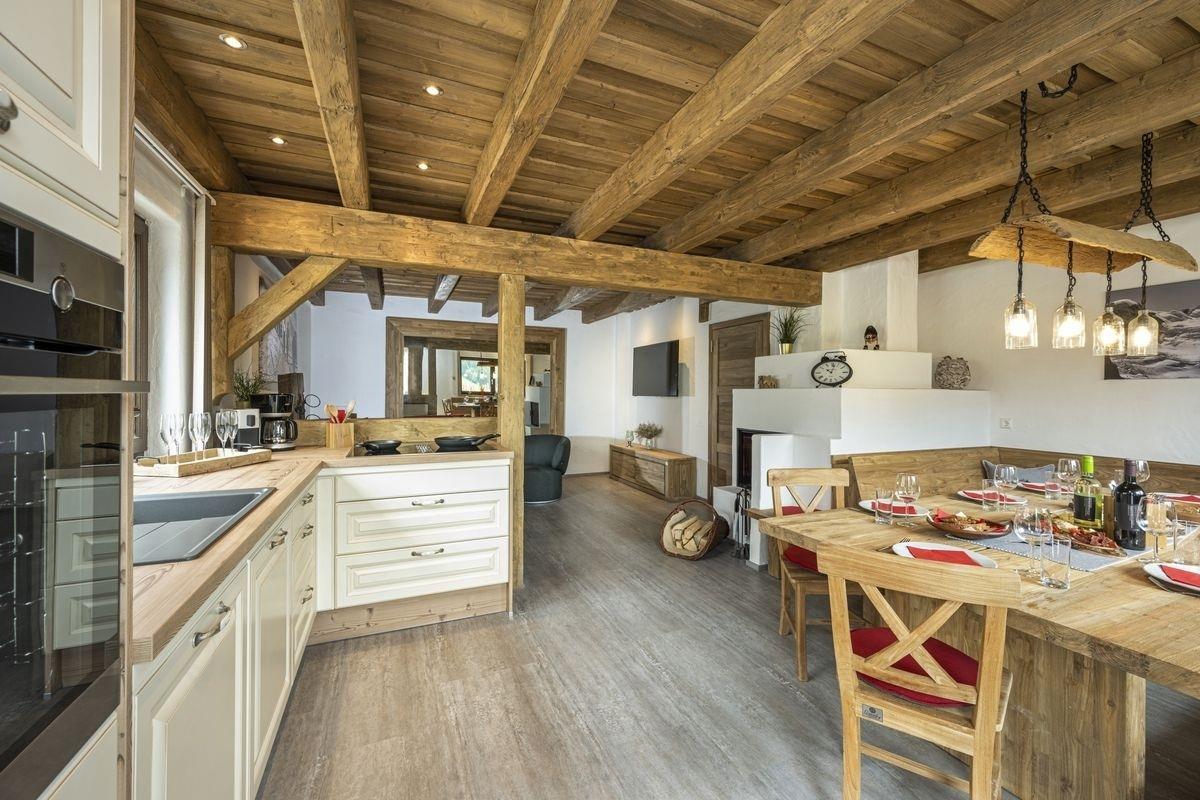 Die moderne Küchenzeile lässt auch bei Profi-Köchen keine Wünsche offen. Neben einem Induktions-Kochfeld gibt es einen Backofen, einen Kühl- und Gefrierschrank sowie allerhand Elektrogeräte. Der große Esstisch bietet allen Gästen ausreichend Platz. Aus dem Wohnbereich gelangt man auf die möblierte Terrasse, welche einen traumhaften Ausblick auf die umliegende Bergwelt bietet.