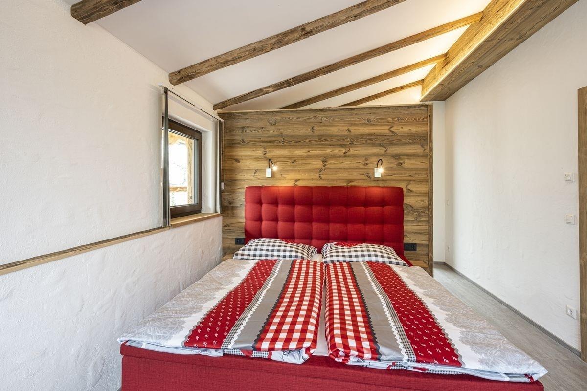 Im Obergeschoss befinden sich die Schlafzimmer. Diese sind aufgeteilt in einen großzügigen Master-Bedroom mit Badezimmer en-Suite (Dusche, Toilette, Waschbecken), begehbarem Kleiderschrank, Couch (bei Bedarf zwei weitere Schlafplätze), Flatscreen-TV, ein privater Balkon und Zugang zum großen Balkon mit bodentiefen Fenstern und Bergpanorama. Die weiteren Schlafzimmer unterteilen sich in ein gemütliches Doppelbettzimmer mit Zugang zum Balkon und ein Vierbettzimmer mit einem Hochbett und einem Doppelbett. Alle Doppelbetten sind hochwertige Boxspringbetten, welche einen erholsamen Schlaf garantieren. Alle Schlafzimmer verfügen über ein Flatscreen-TV. Im Obergeschoss befindet sich zudem ein weiteres Badezimmer mit Dusche und Waschtisch sowie eine räumlich getrennte Toilette.