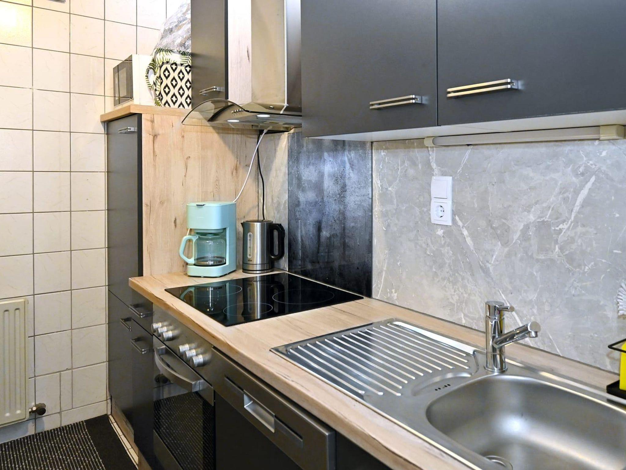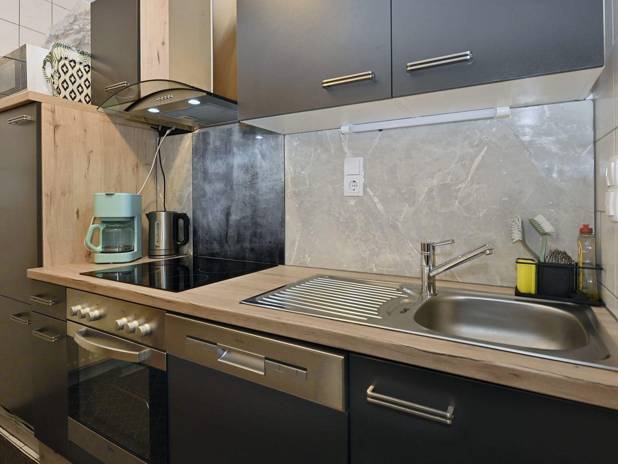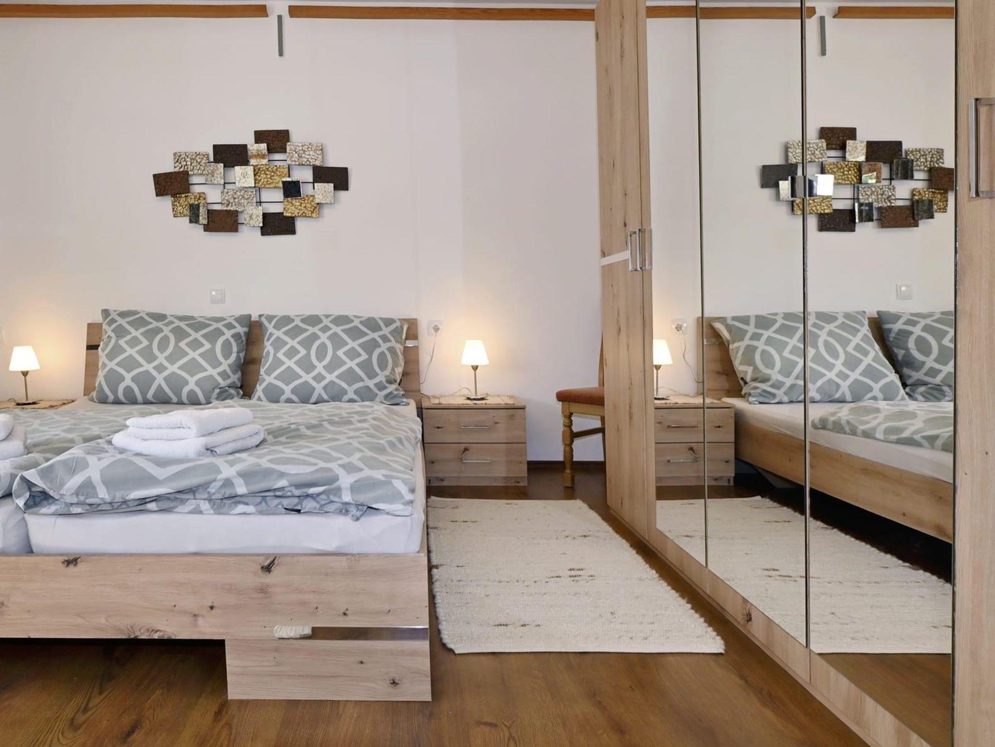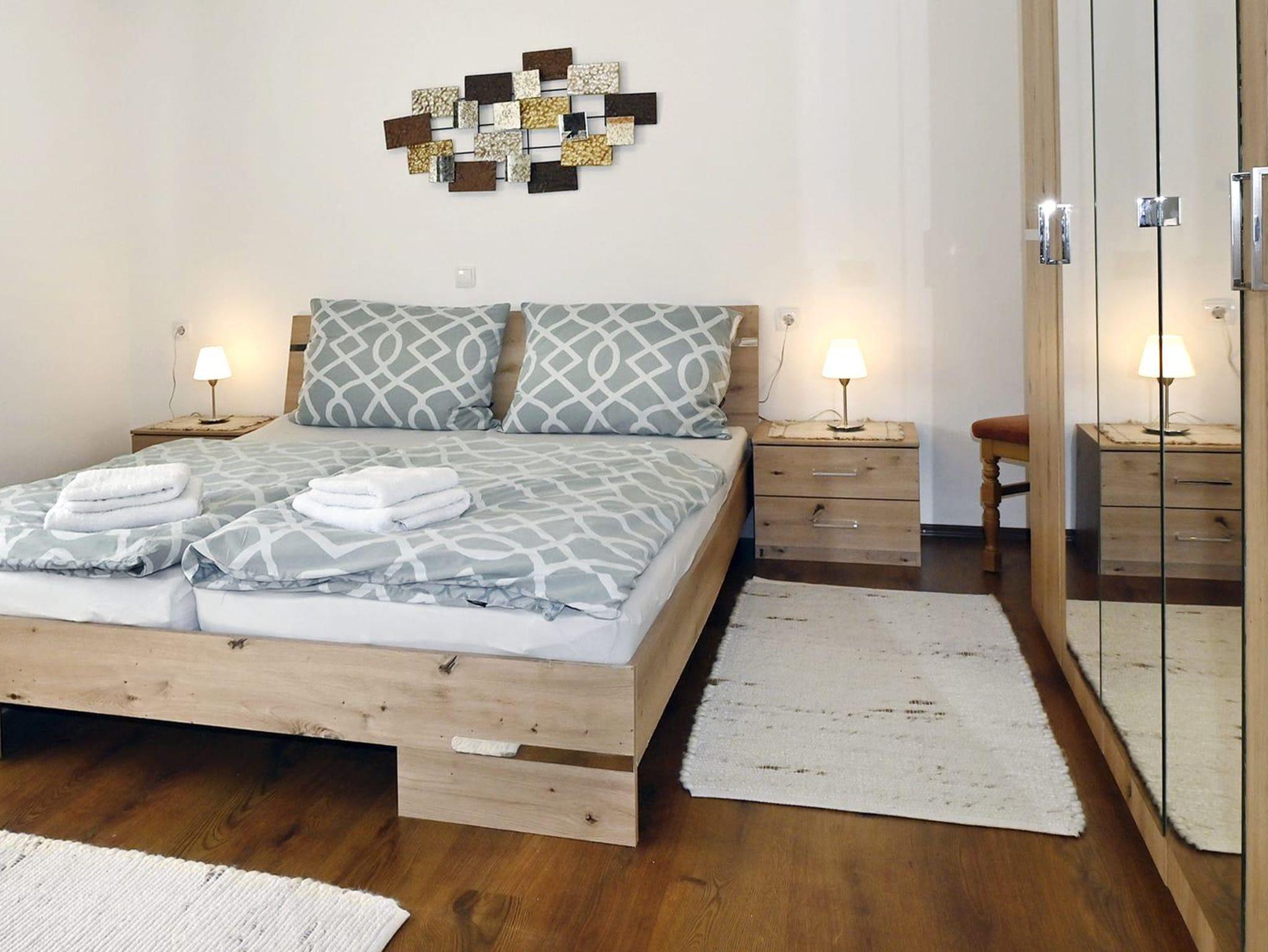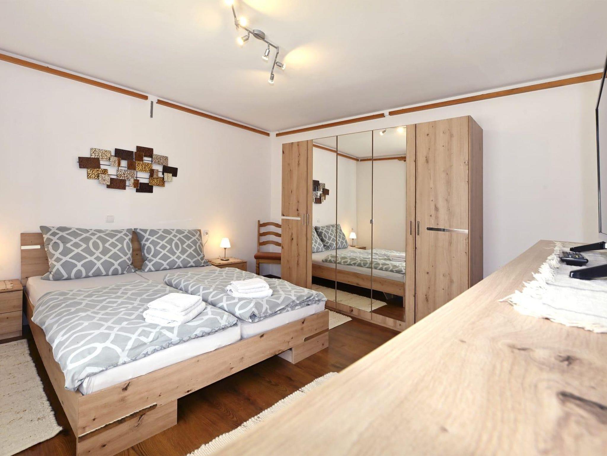 Die Ferienwohnung ist ausgestattet mit einem Schlafzimmer mit Doppelbett und einem Klappbett, Badezimmer mit Dusche und WC, Wohn- Esszimmer mit Ausziehcouch 120cm auf 200cm und einer Küche. Die Küche ist komplett ausgestattet mit einem Geschirrspüler, Kühlschrank, Vierplattenherd und Backrohr, Mikrowelle und Kaffeemaschine.