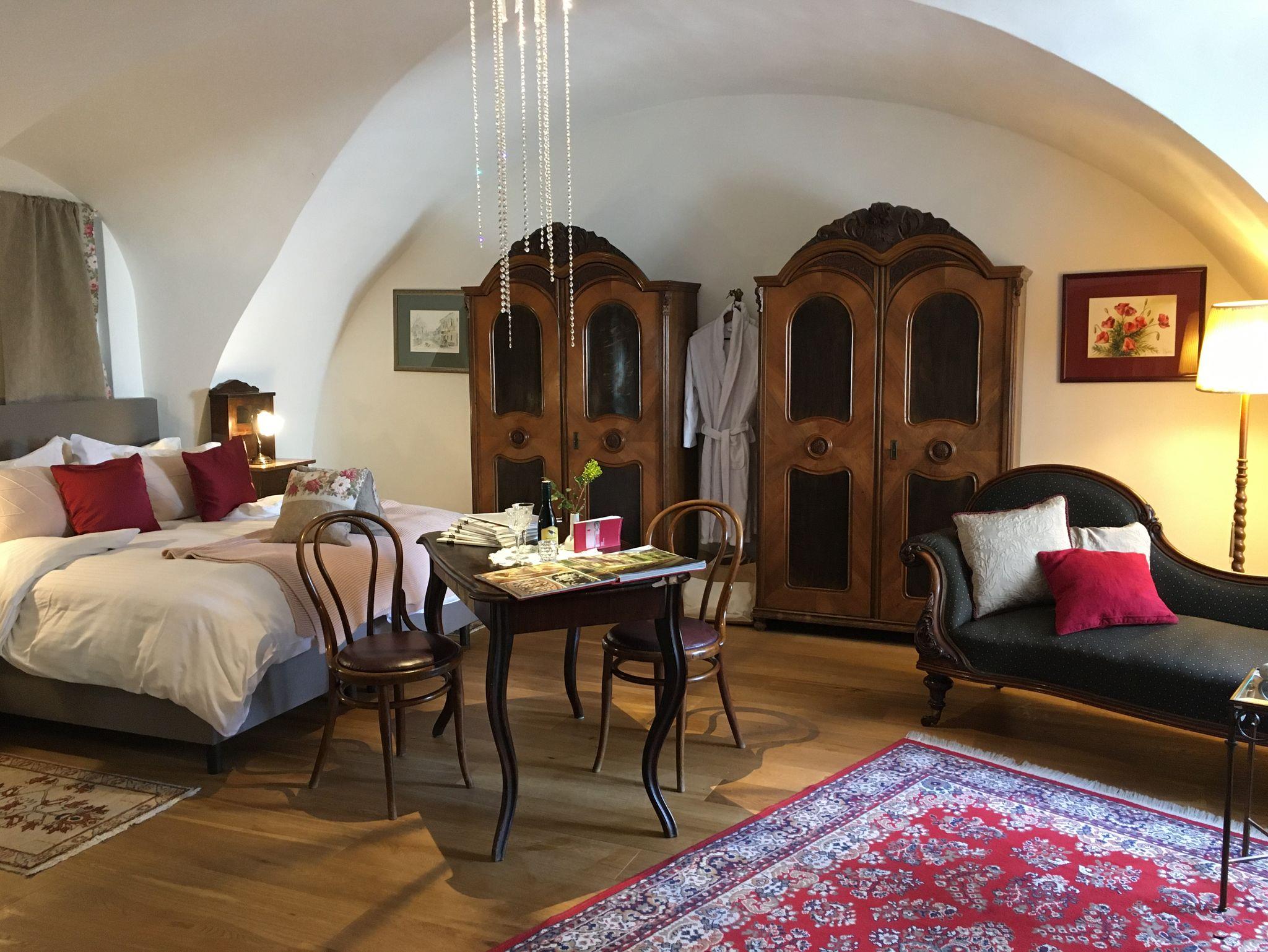 Das geräumige Romantikzimmer des goldenen Ankers verfügt über Badewanne, WC, Flatscreen-Kabel TV, Minibar, Wasserkocher, Safe, Föhn, Telefon und Wifi.