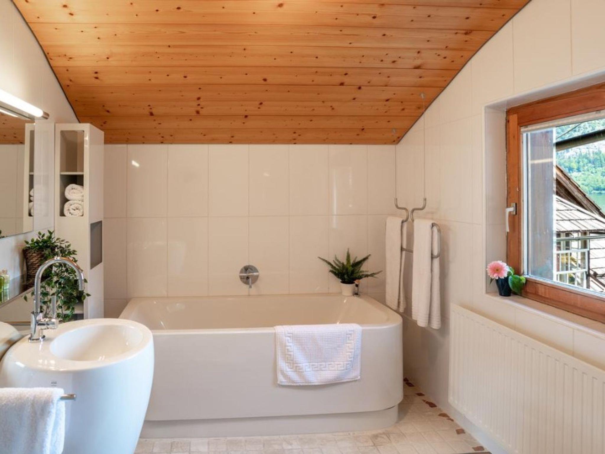 Authentizität auf hohem Niveau: Der See ist in jedem Zimmer spürbar - von Wohn- und Schlafzimmer aus blicken Sie auf den See, aber auch beim Zähneputzen können Sie den Blick über den See schweifen lassen. Und der Tag beginnt schon ganz entschleunigt. Und wenn die Tage wieder kürzer werden und der Herbst in Hallstatt Einzug hält, gibt es kaum etwas entspannenderes als ein Bad in der großzügigen Badewanne als Abschluss eines Tages. Das Wohnzimmer ist mit einer kleinen Küche mit kleinem Kühlschrank, einem Kochfeld, einer Nespresso-Kaffeemaschine und Teekessel ausgestattet, sodass Sie auf ihrem Traumbalkon frühstücken können.