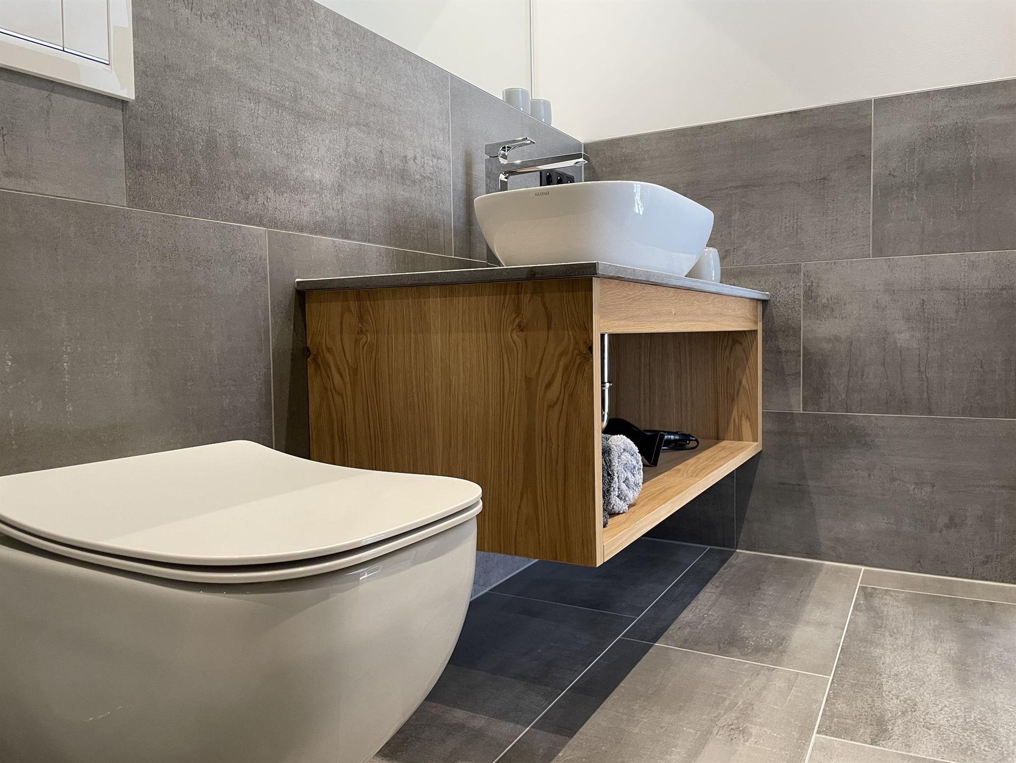 -Badezimmer: Dusche, WC, Handtuchtrockner, Föhn, Handtücher