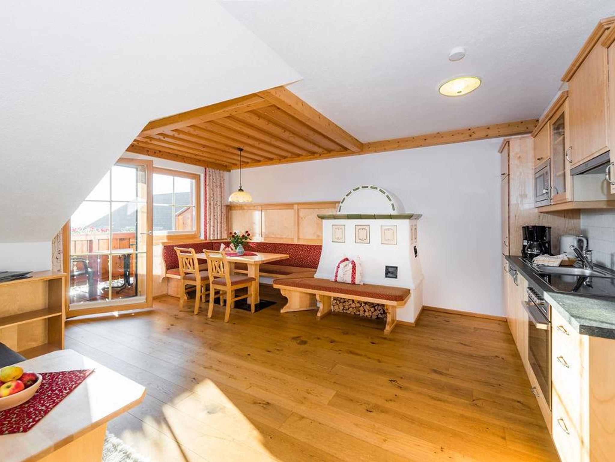 • Gemütliche und geräumige Wohnküche mit Kachelofen, Fußbodenheizung, Essecke, Couch und großem Balkon