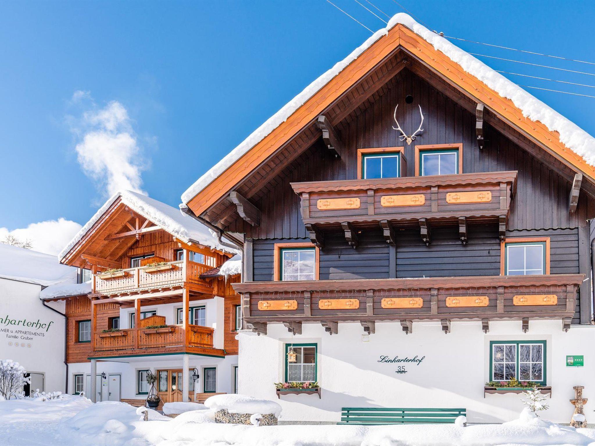 Aber auch der Winter zeigt sich am Linharterhof von seiner schönsten Seite. Mit dem Skibus, der nur 2 Gehminuten von unseren Ferienwohnungen entfernt ist, kommen Sie am schnellsten Wege zum Hauser Kaibling, dem östlichen Ersteinstieg in die Schladminger 4-Berge-Skischaukel. Nach einem tollen Skitag können Sie Ihre Ski im Skiraum mit Schuhtrockner sicher abstellen.