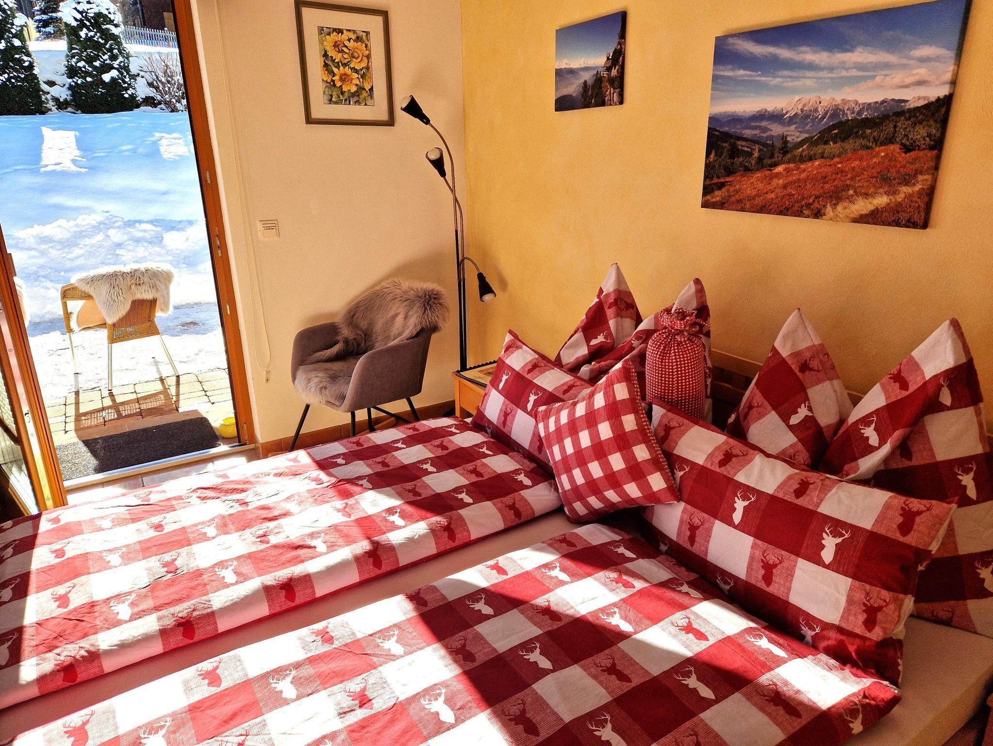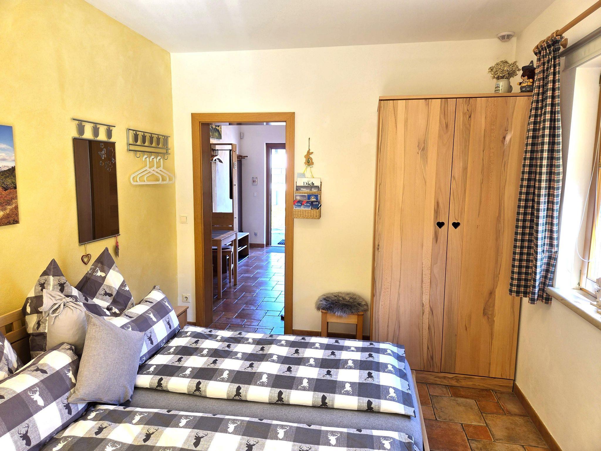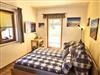 Das Schlafzimmer hat ein großes Fenster und eine Türe auf die Terrasse mit Tisch und Stühle, wo Sie vor allem in den Sommermonaten gemütlich verweilen und die Natur genießen können.