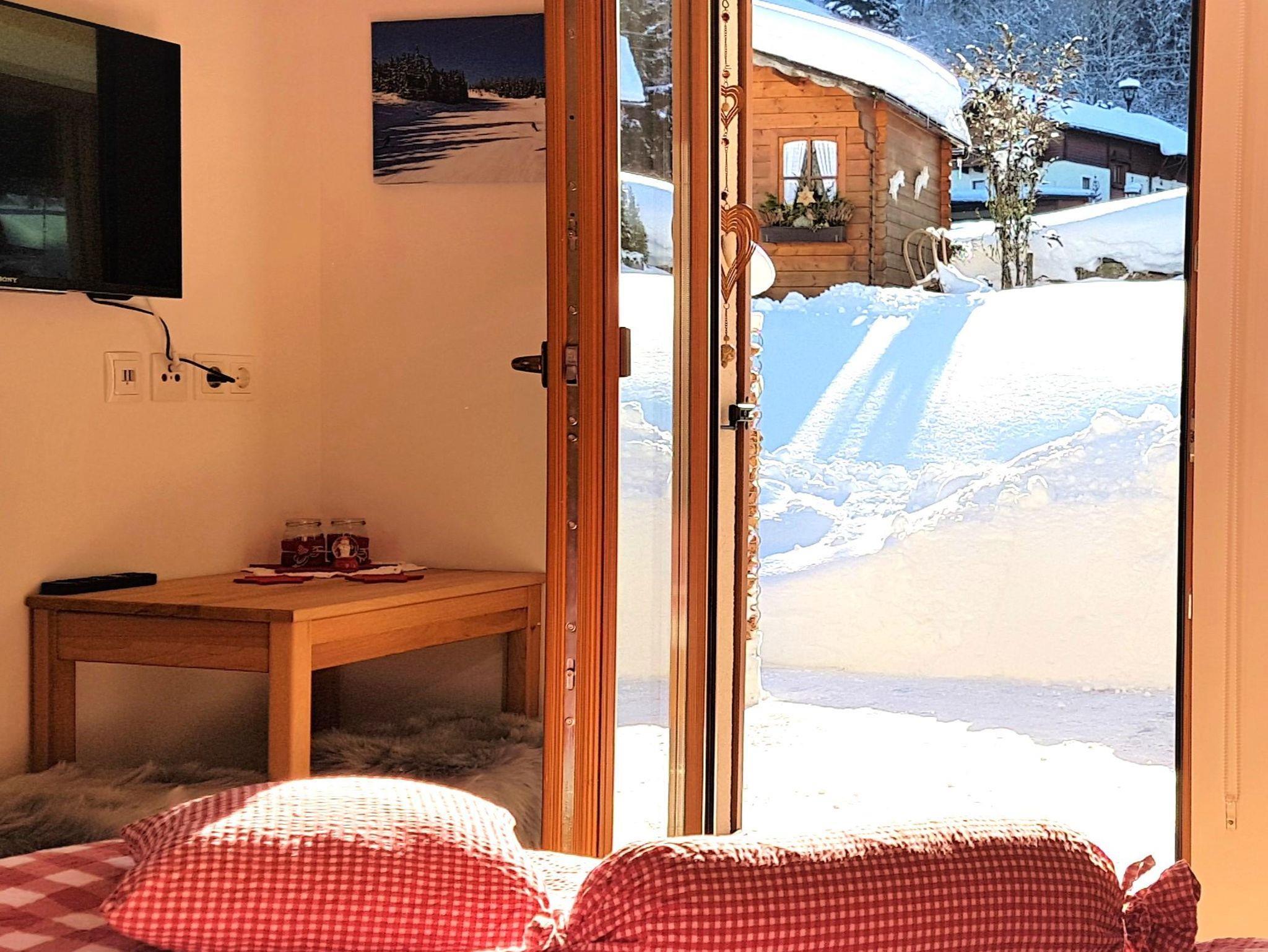 Im Vorraum bietet die Garderobe einen Stellplatz für Ski und Schuhe. Ein kleiner Tisch mit 2 Stühlen lädt zum Essen ein.