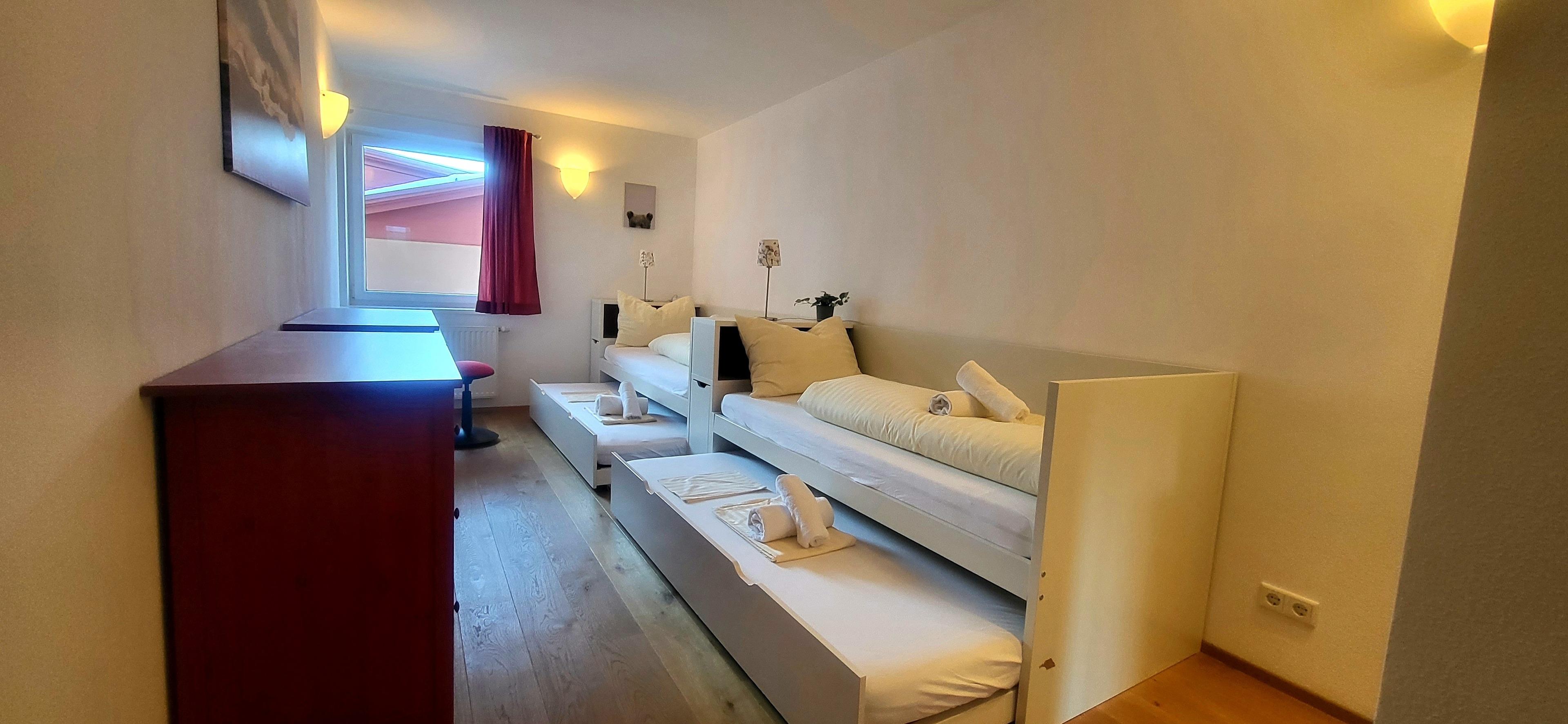 Die Wohnung bietet einen großzügigen Koch-, Wohn- und Essbereich mit traumhaftem Blick auf die umliegende Bergwelt. Ein Schlafzimmer ist mit einem Doppelbett ausgestattet, das zweite mit zwei Einzelbetten und zwei ausziehbaren Zusatzbetten. Ein Badezimmer sowie ein separates WC sorgen für zusätzlichen Komfort.