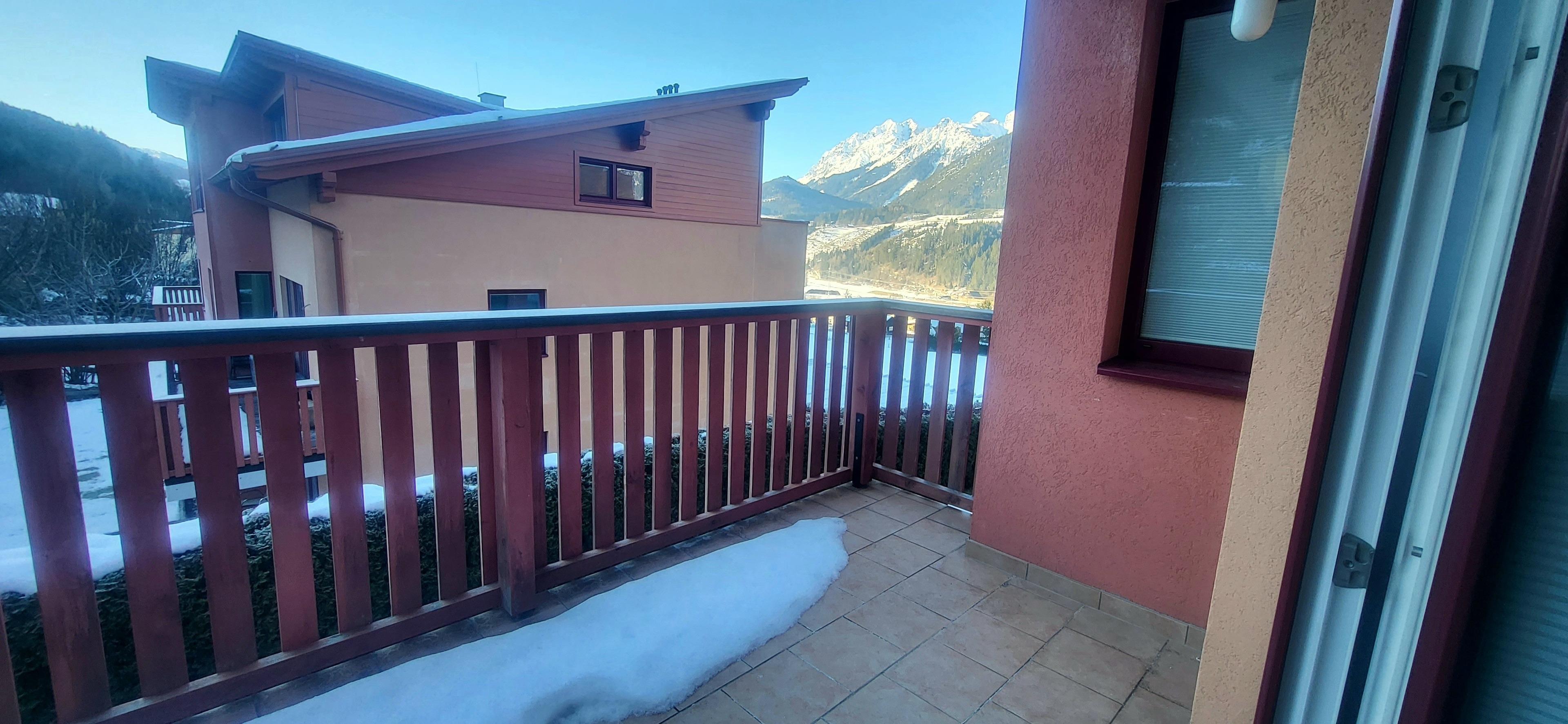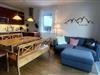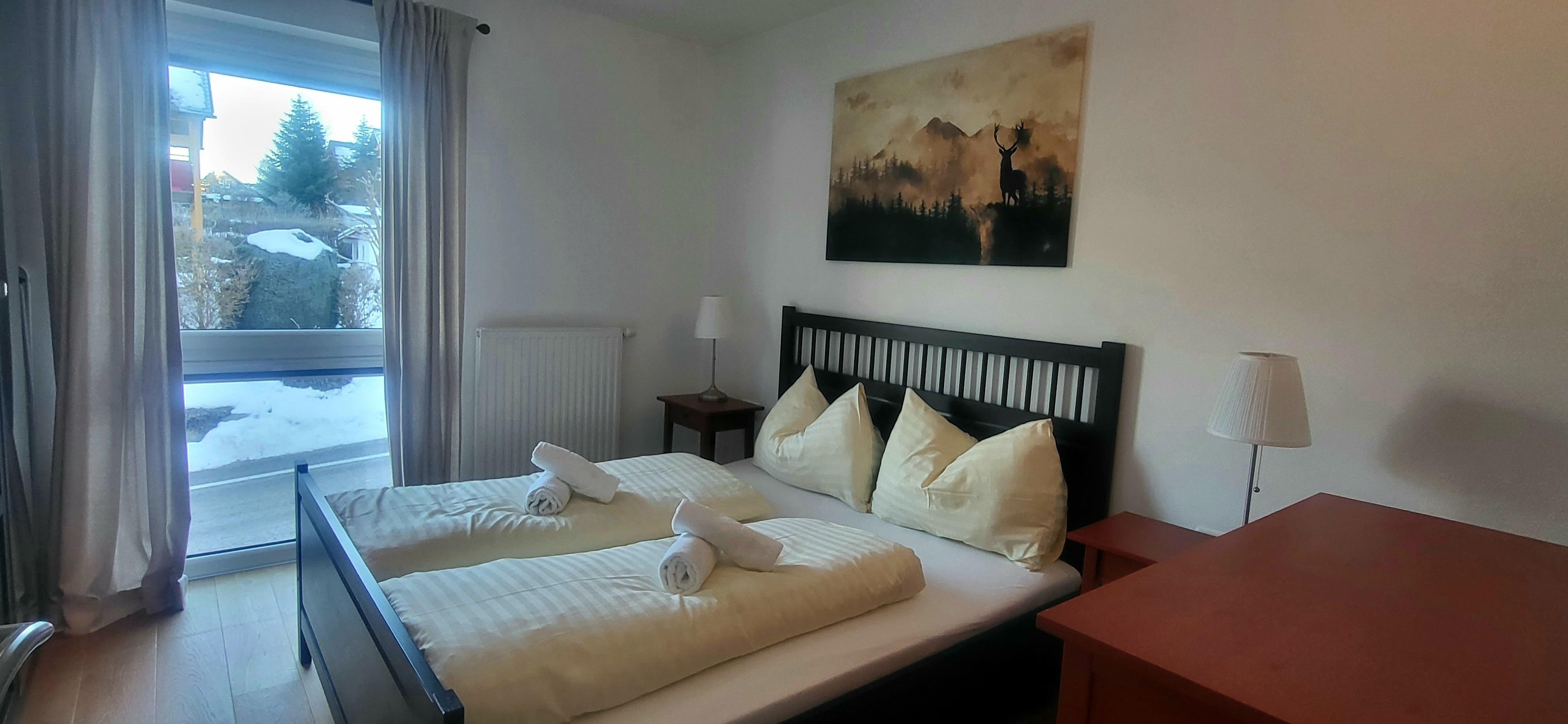 The apartment features a spacious open-plan kitchen, living, and dining area with stunning views of the surrounding mountains. It includes one bedroom with a double bed and another with two single beds and two pull-out beds, a bathroom, and a separate toilet.