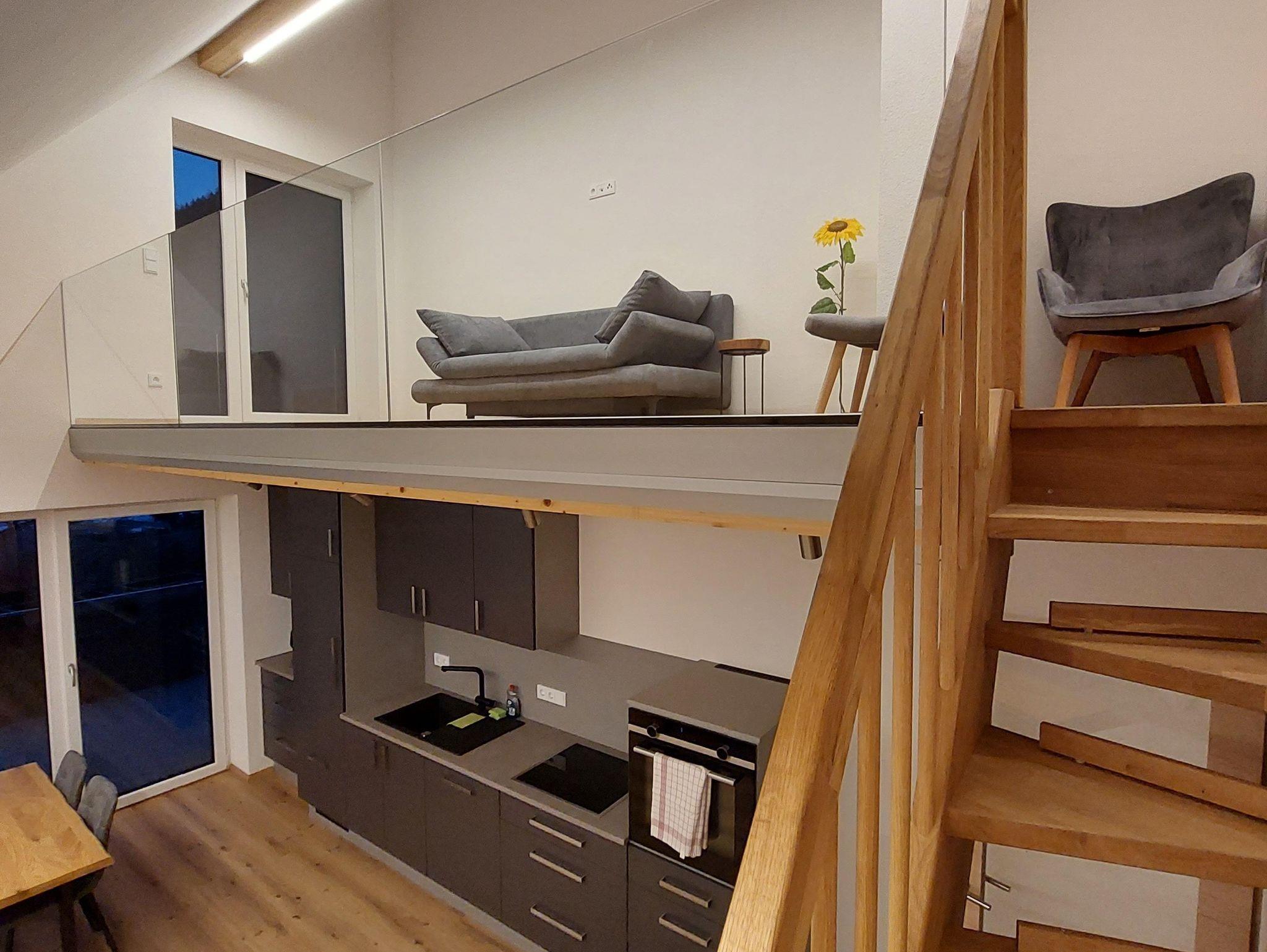 Das geräumige Wohlfühl-Apartment im ersten Stock ist auf 2 Etagen aufgeteilt und besteht aus Schlafzimmern, Wohn-Küche, einer Terrasse, einem Balkon, Bad und WC.
