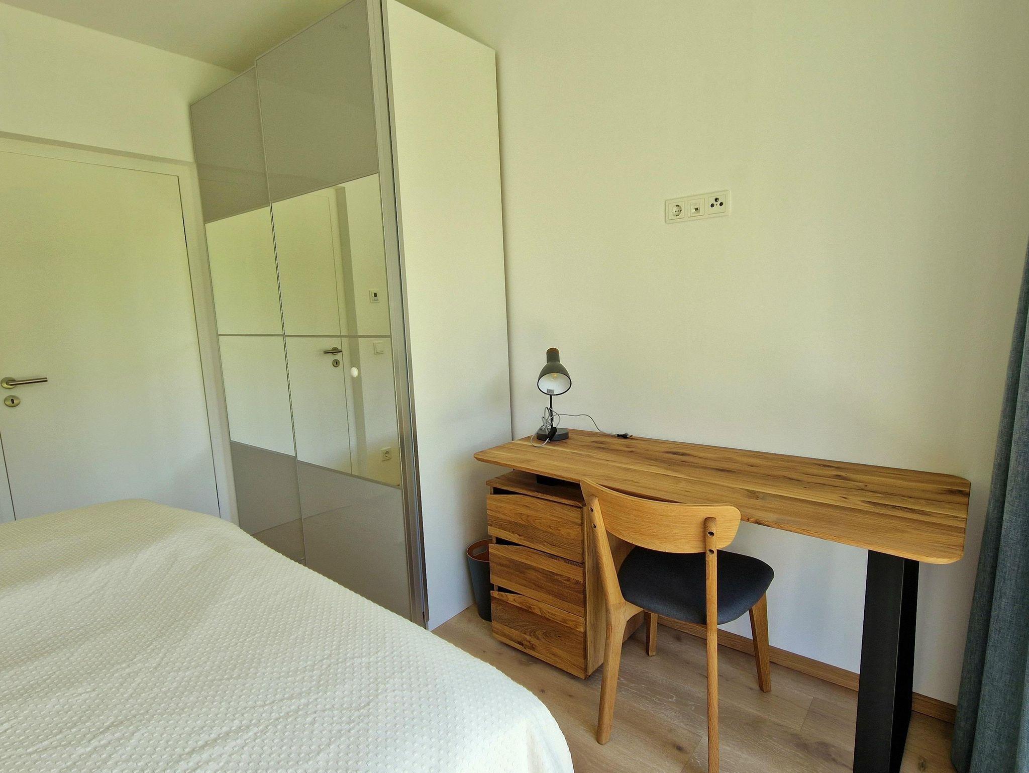 Die Ferienwohung ist rund 75m² gross und besteht aus einem Vorraum, Gäste-WC, Wohnzimmer, Küche, 2 Schlafzimmern, Bad mit Dusche, Terrasse und Garten. Die Küche ist eine Einbauküche der Marke DAN, voll ausgestattet mit Spüle, Geschirrspüler, Herd, Backrohr. Cafe-Maschine, Wasserkocher, Toaster, Eierkocher, Fondue-Geschirr etc. Geschirr, Bettwäsche, Handtücher stehen zur Verfügung.