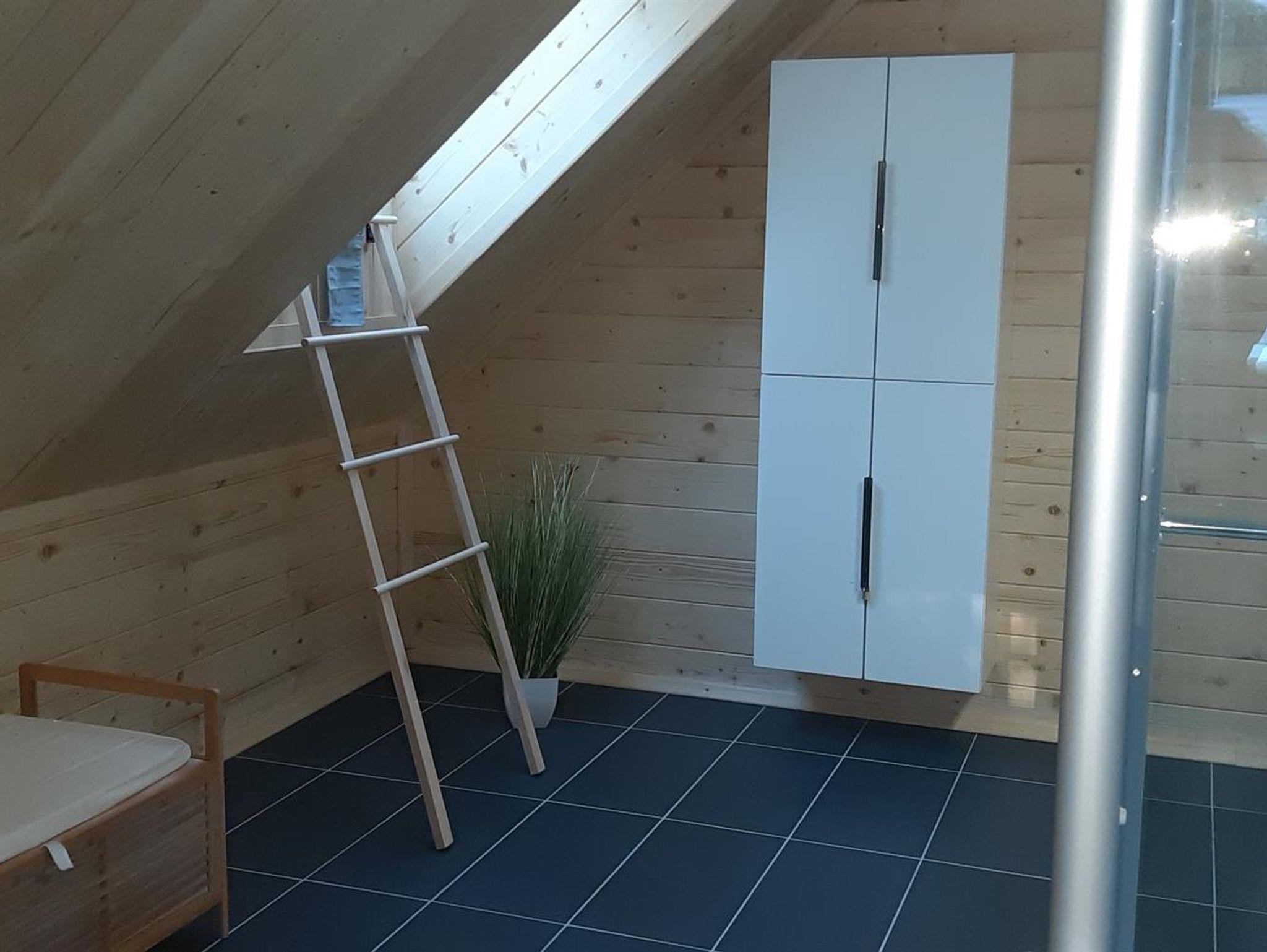 Im Garten befindet sich eine Fass-Sauna zur Alleinnutzung. Im EG befindet sich ein Schlafzimmer mit Doppelbett. Bad mit Tageslicht, Fussbodenheizung Dusche/WC/ Fön sowie eine Waschmaschine/Trockner. Wohn-und Esszimmer mit einem Holzofen schließen an die offene Küche an. Von hier kommt man auf die große Veranda mit Blick auf die Karawanken.