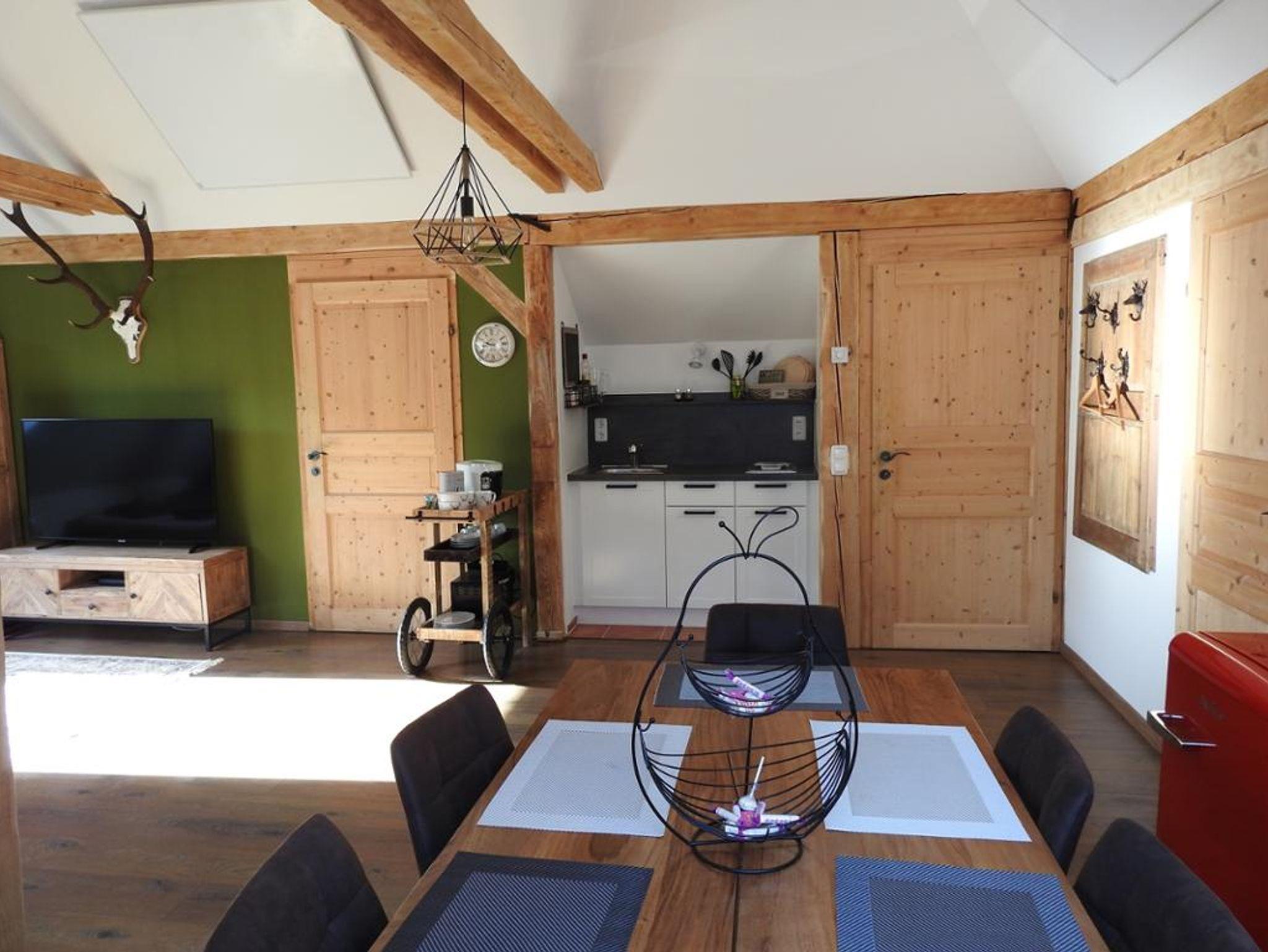 Die gemütliche Dachgeschosswohnung für bis zu vier Personen ist ausgestattet mit TV, WLAN, Kaffeemaschine, Föhn und einer kleinen Küche und bietet somit Komfort für Familien und Paare.