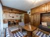 Wohn-und Essraum: großer Esstisch mit Eckbank, ausziehbare Couch und TV;