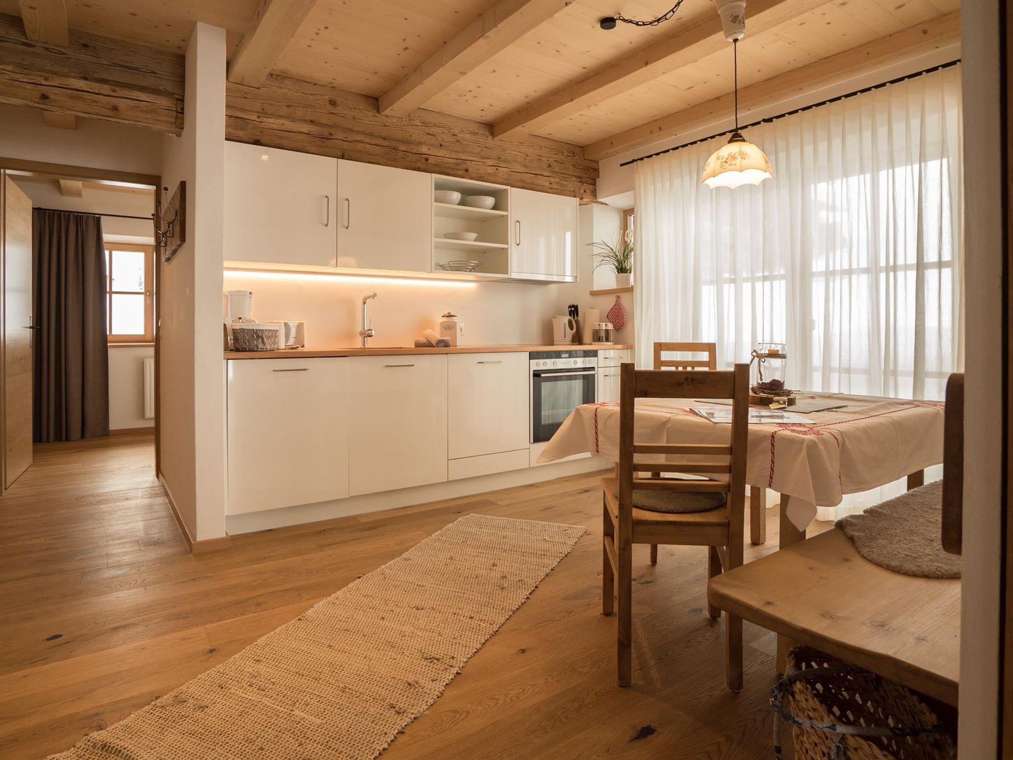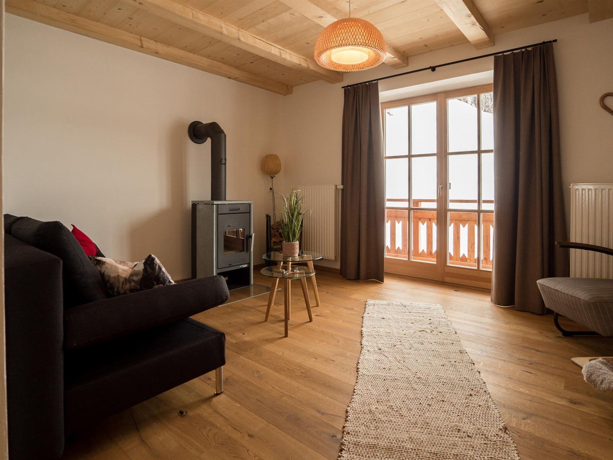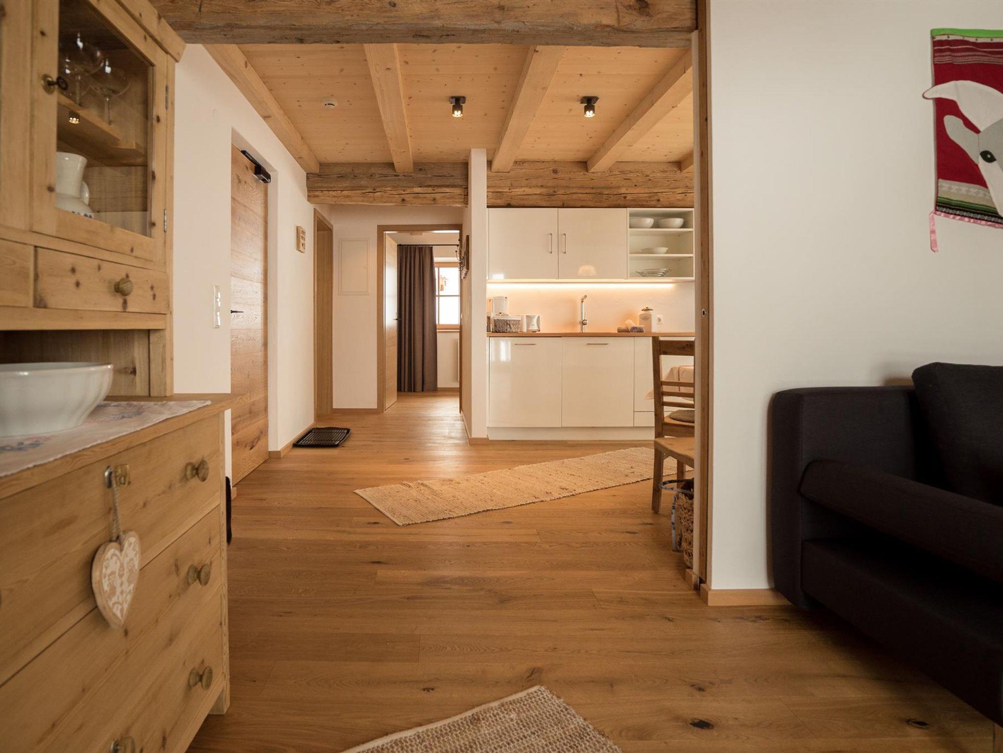 Unterstadel liegt im Hangbereich. Moderne und traditionelle Möbelstücke wechseln sich hier ab und verleihen der Wohnung einen gemütlichen Charme. Die Wohnung besitzt eine großzügige Terrasse mit Panoramablick sowohl ins Tal als auch zu den Gipfeln.