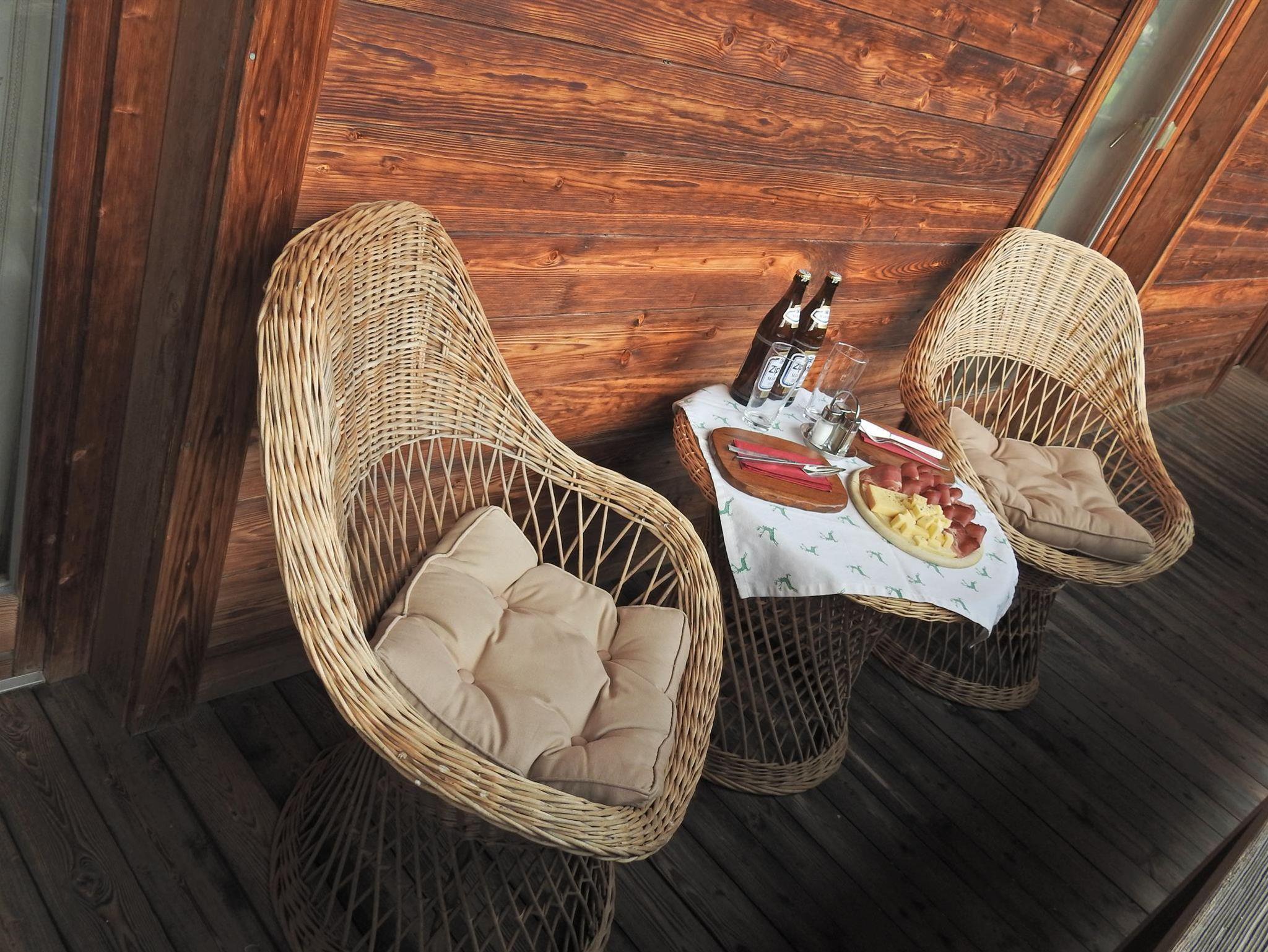 Zusätzlich zur Fußbodenheizung bietet bei Bedarf ein Kachelofen wohlige Wärme. Auf dem Balkon mit Terrassenmöbeln genießen Sie einen herrlichen Ausblick in die Natur.