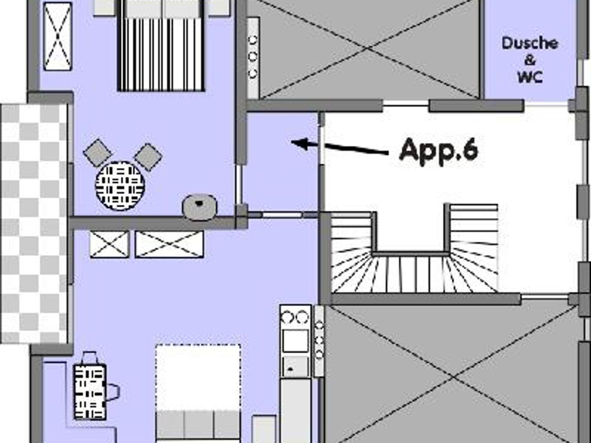 RAUMAUFTEILUNG: Da es auf dieser Etage keine weiteren Räumlichkeiten gib, kann der großzügige Stiegenhausbereich auf dieser Etage für Schuhe und Gepäck mitbenutzt werden. Das Appartement besteht aus einem Schlafzimmer mit einem Doppelbett, einem Wohn- Schlafbereich mit einem komfortablen Ausziehbett eine kleine, komplett ausgestattete Kochnische, Essecke + SAT-TV. Ein Vorraum, ein vorgelagertes Badezimmer mit Dusche und WC und ein kleiner nach Süden ausgerichteter Balkon.