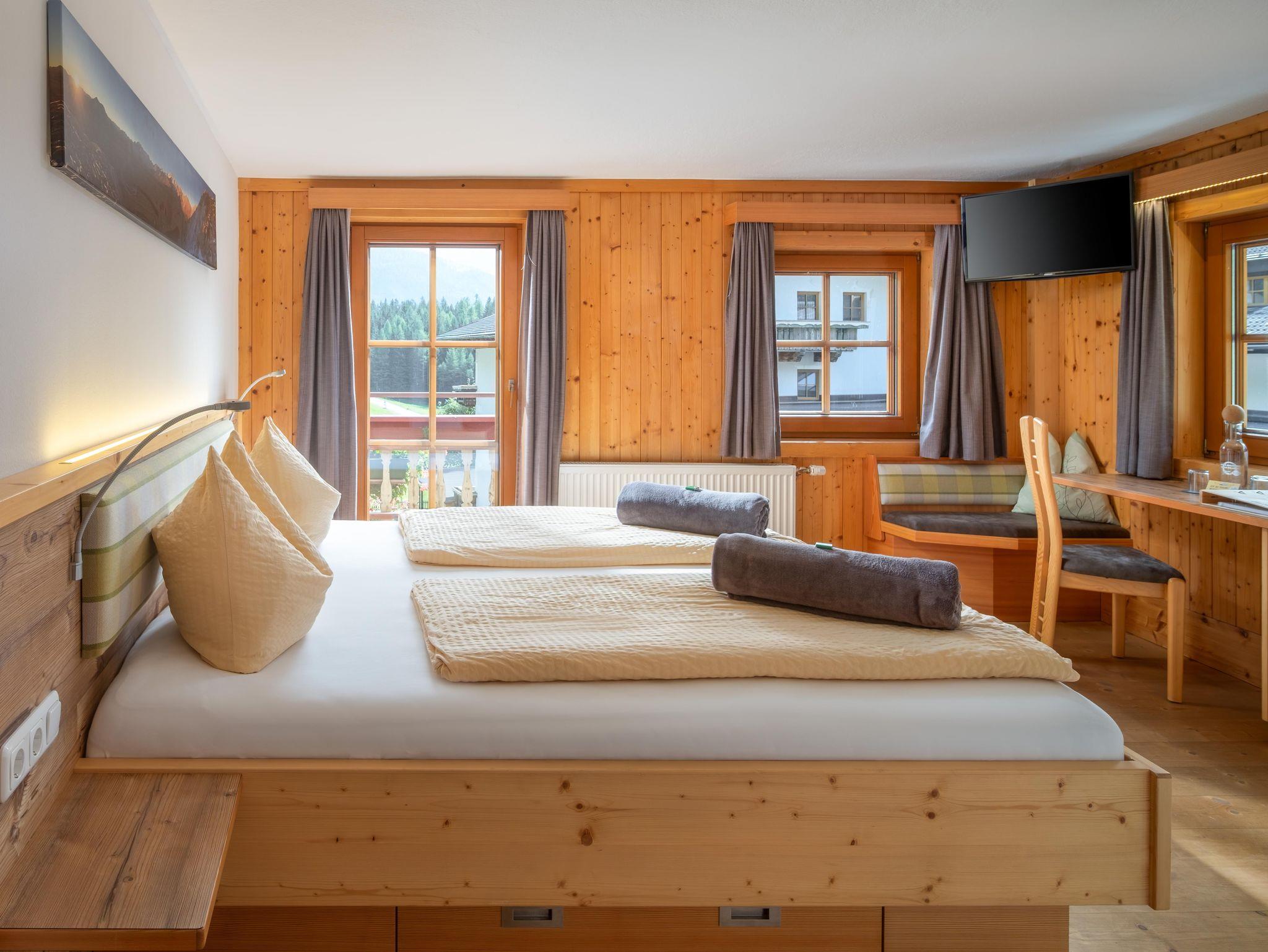 Im Zimmer Kendlspitz die Zweisamkeit genießen. Laß den erlebnisreichen Tag bei einem Glas Wein auf dem Balkon mit Blick auf die herrliche Bergwelt ausklingen. Das Rauschen des Wassers und das Zwitschern der Vögel unterhalten dich dabei.
