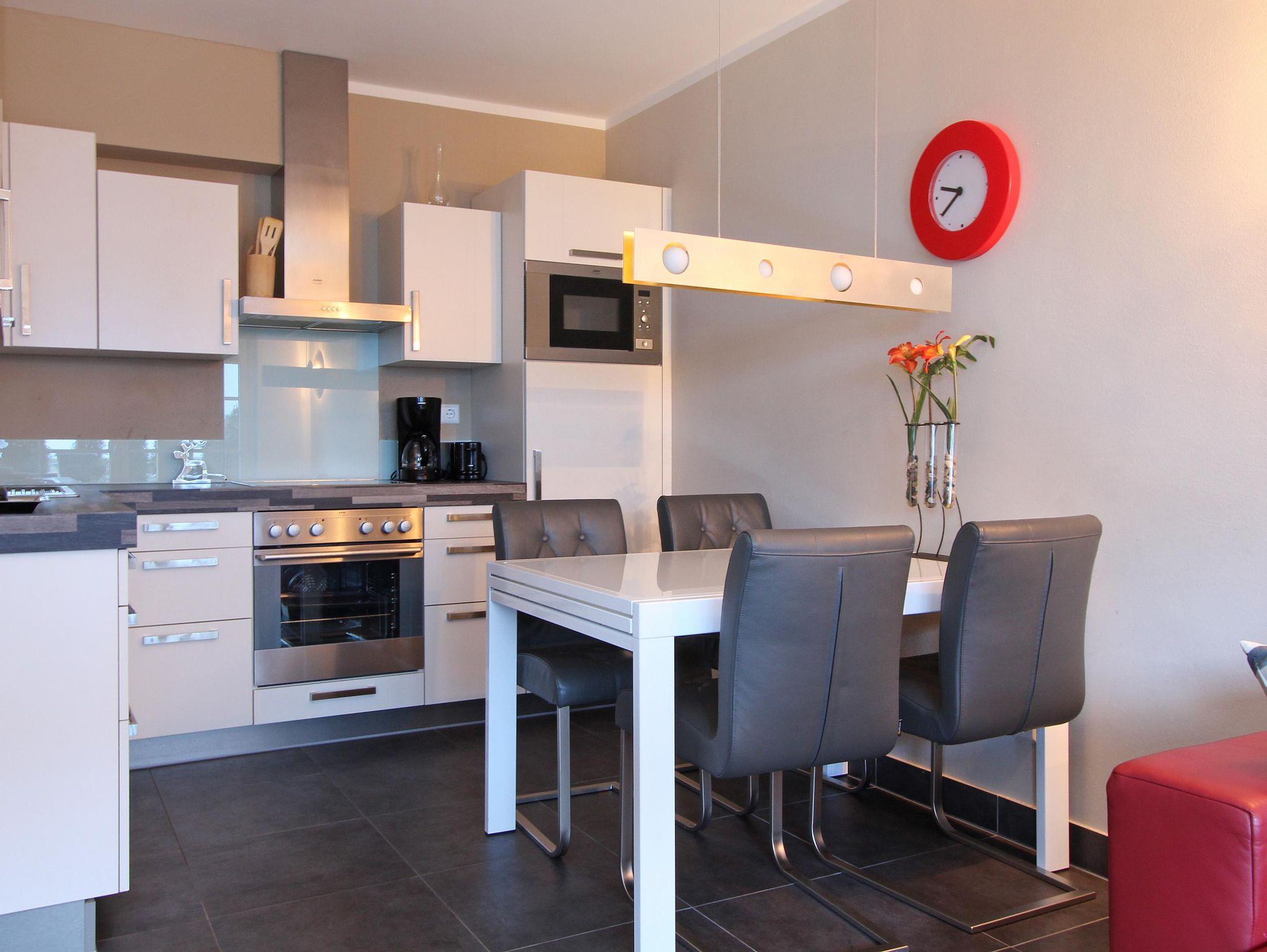 Dieses gemütliche Apartment liegt im Erdgeschoss und besteht aus zwei großen Schlafzimmern mit zwei Badezimmer. Eines der Schlafzimmer ist mit einem Doppelbett sowie einem Etagenbett und einem Badezimmer mit Dusche ausgestattet. Das andere Schlafzimmer beinhaltet ein Doppelbett und ein Badezimmer mit Badewanne und separater Dusche. Der Wohnbereich ist großzügig konzipiert mit einem Esstisch, einer offenen Design-Küche und einem schönen Sitzbereich. Zur großen Terrasse gelangt man direkt vom Wohnzimmer aus.