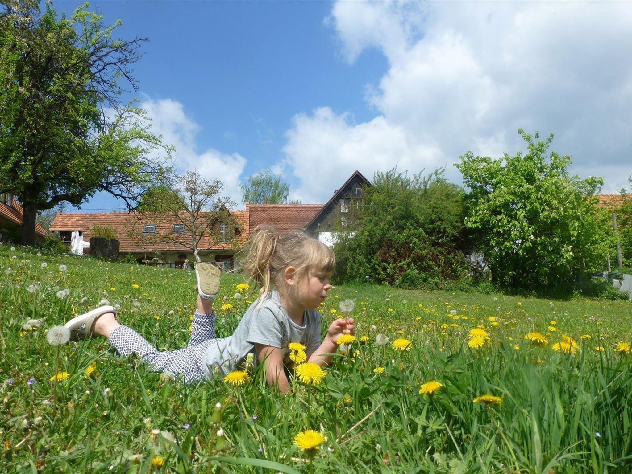 Der angrenzende kleine Wald bietet Entspannung pur beim Waldbaden. Am Waldesrand erfreuen sich Kinder am Trampolin, beim Sandspielen und Schaukeln.