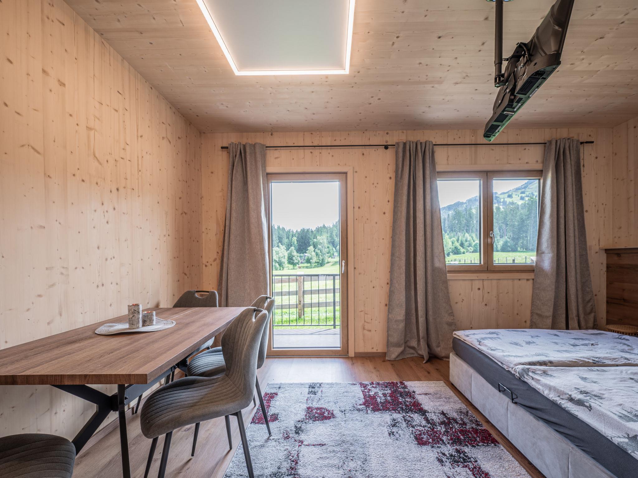 "2 Zimmer", 2-Zimmer-Wohnung 30 m2. Schön und gemütlich eingerichtet: Wohn-/Schlafzimmer mit 1 Doppelbett (180 cm, Länge 200 cm), Esstisch und TV (Flachbildschirm). Offene Küche im Eingang (Backofen, 2 Glaskeramikplatten, Toaster, Wasserkocher, elektrische Kaffeemaschine). Dusche/WC. Heizung. Balkon. Balkonmöbel. Schöne Panoramasicht auf den See, die Berge und Hahnenkamm. Gratis. Bitte beachten: Nichtraucher-Unterkunft. Rauchmelder.