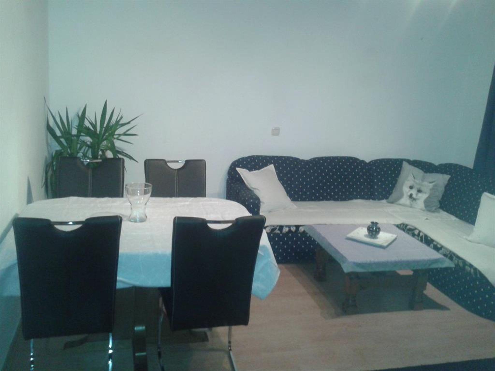 Schlafzimmer mit 4 Betten Vorraum mit Küchenblock daneben die Speise Wohnzimmer mit Esstisch und Auszieh-Couch -Fernseher Bad mit Badewanne und Dusche und Trennwand -WC Begehbarer Schrank mit Regalen und Schreibtisch
