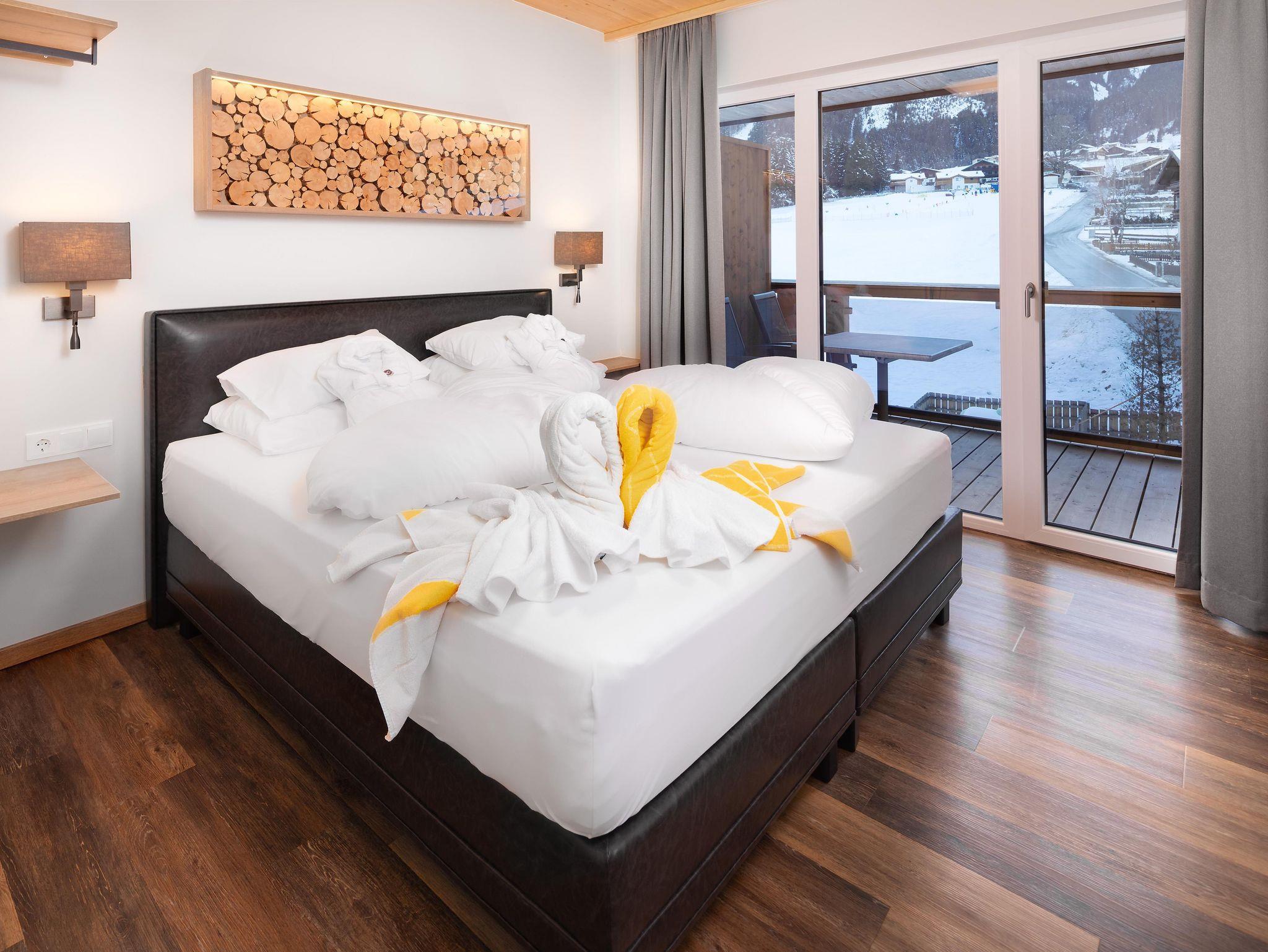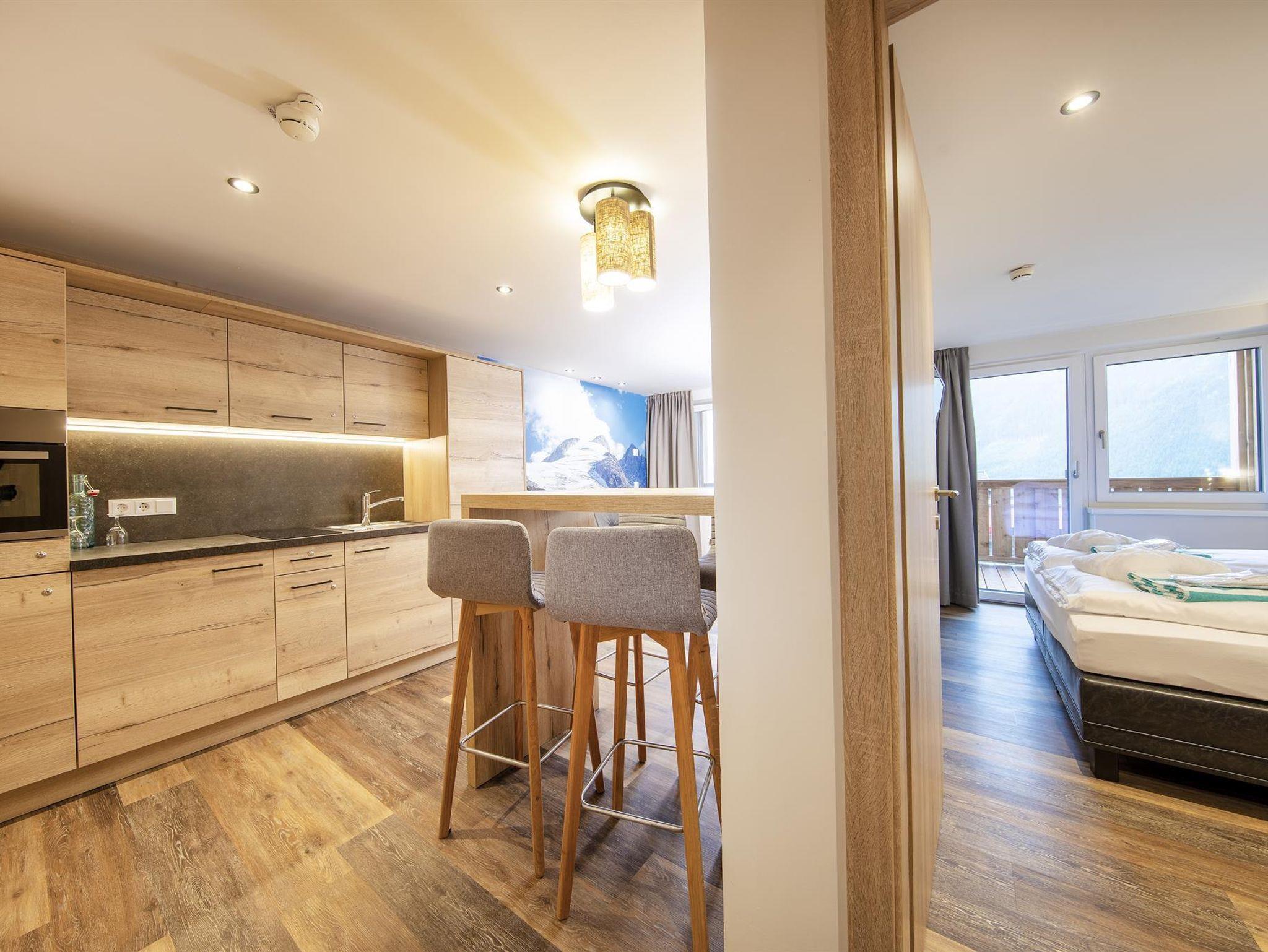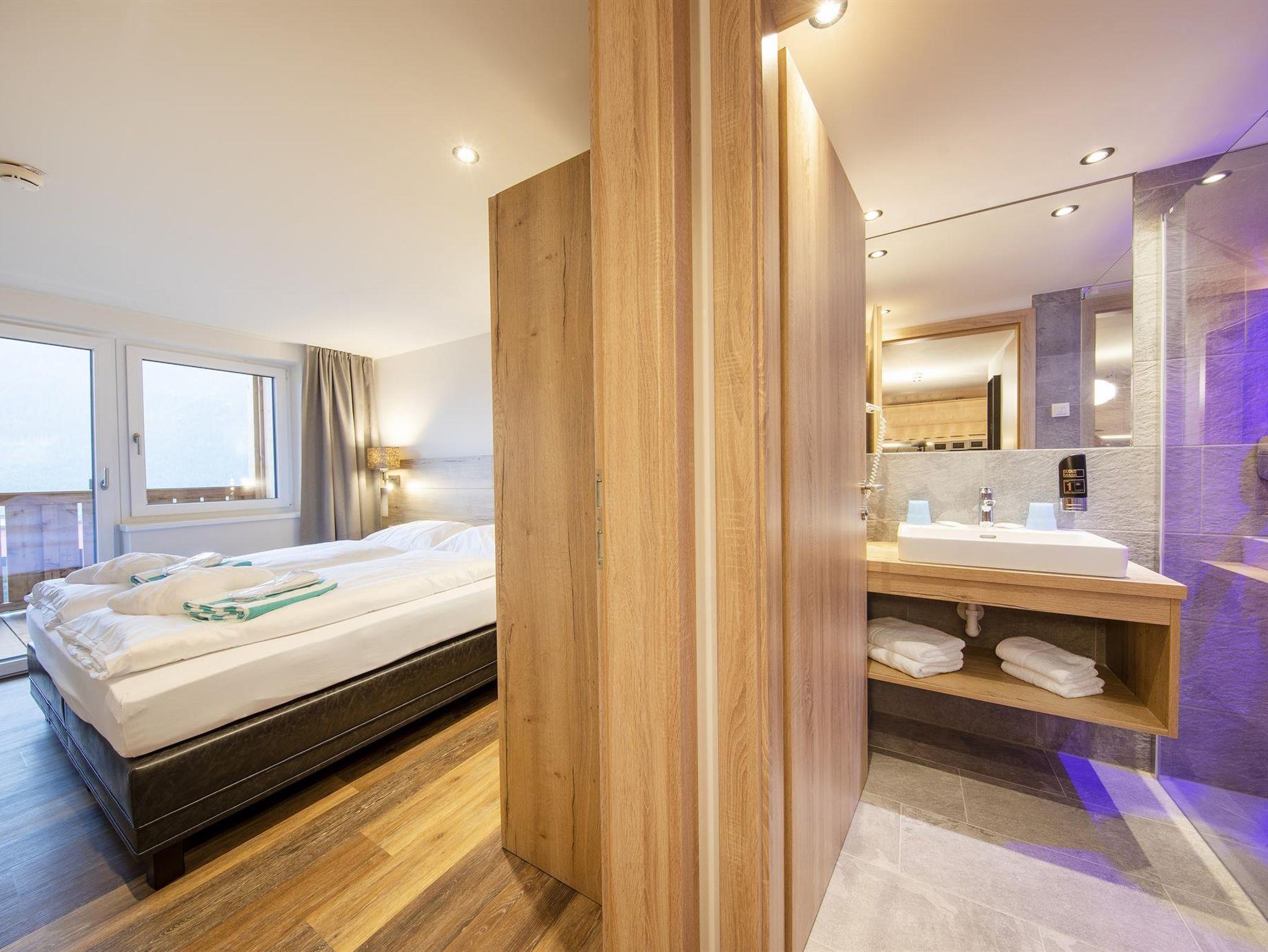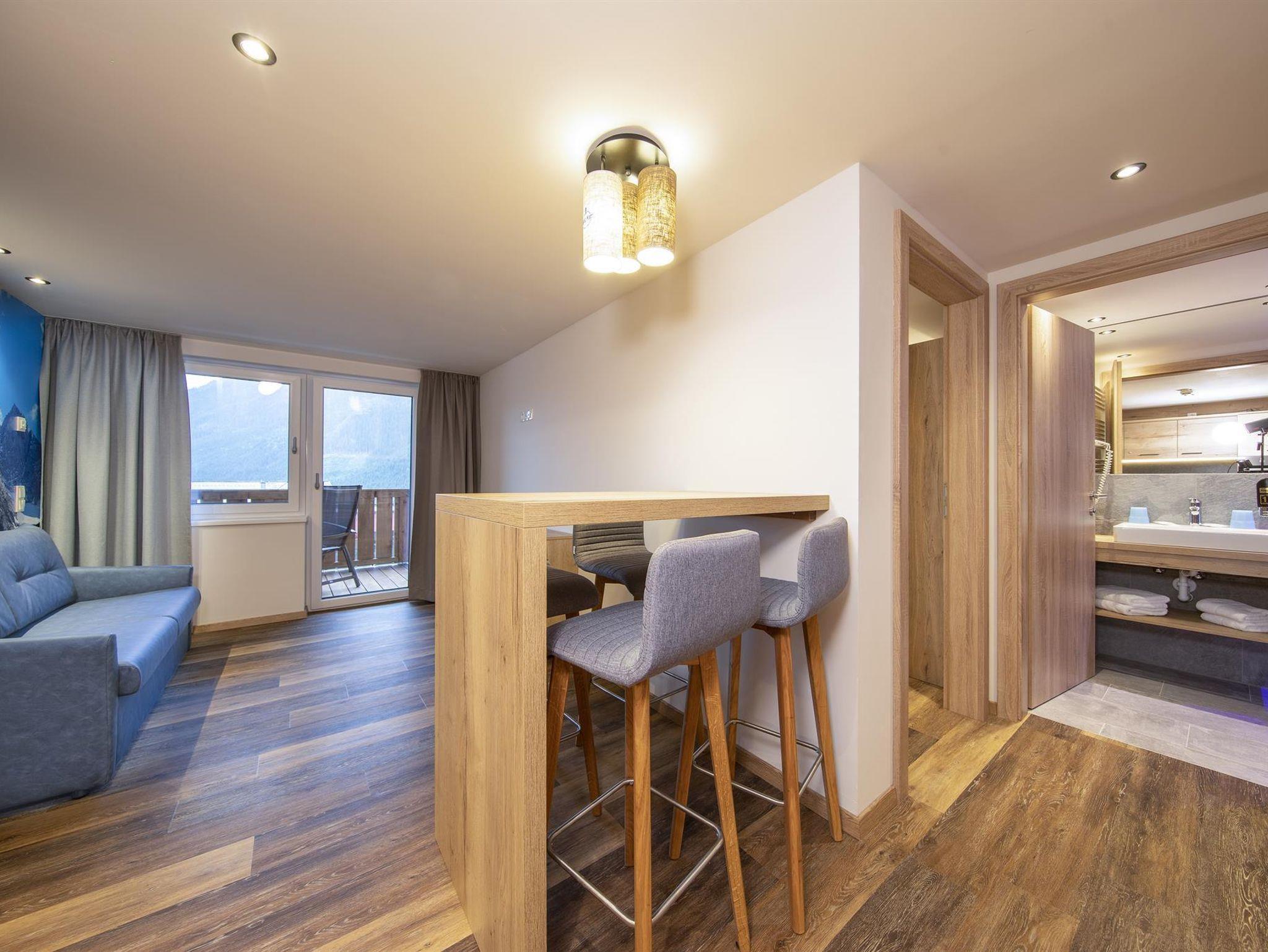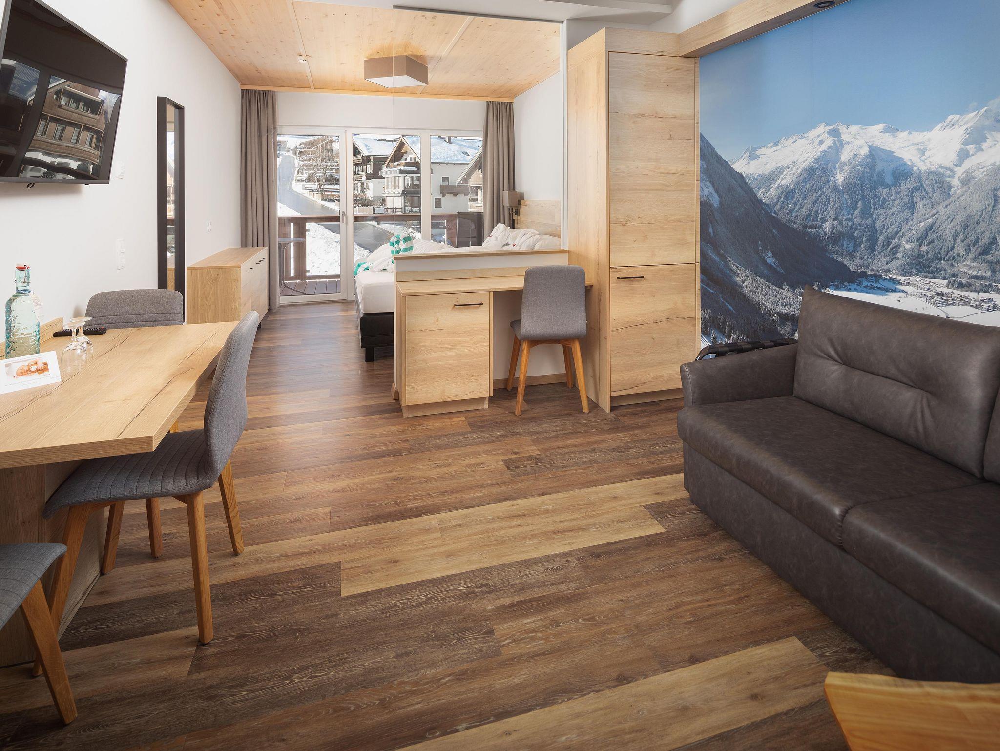 Die im Frühjahr 2019 komplett renovierten Hotelappartements (für 1-4 Pers.) im alpin-modernen Design wurden mit natürlichen Materialien ausgestattet. Die allergikergerechte Ausstattung sorgt für Wohnkomfort mit höchsten Ansprüchen. Dieses Appartement verfügt über ein getr. Schlafzimmer, einem Wohnraum mit Ausziehcouch und getr. WC und Badezimmer. Vom eigenen Balkon genießen Sie den Panoramablick auf die Berge.