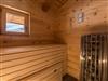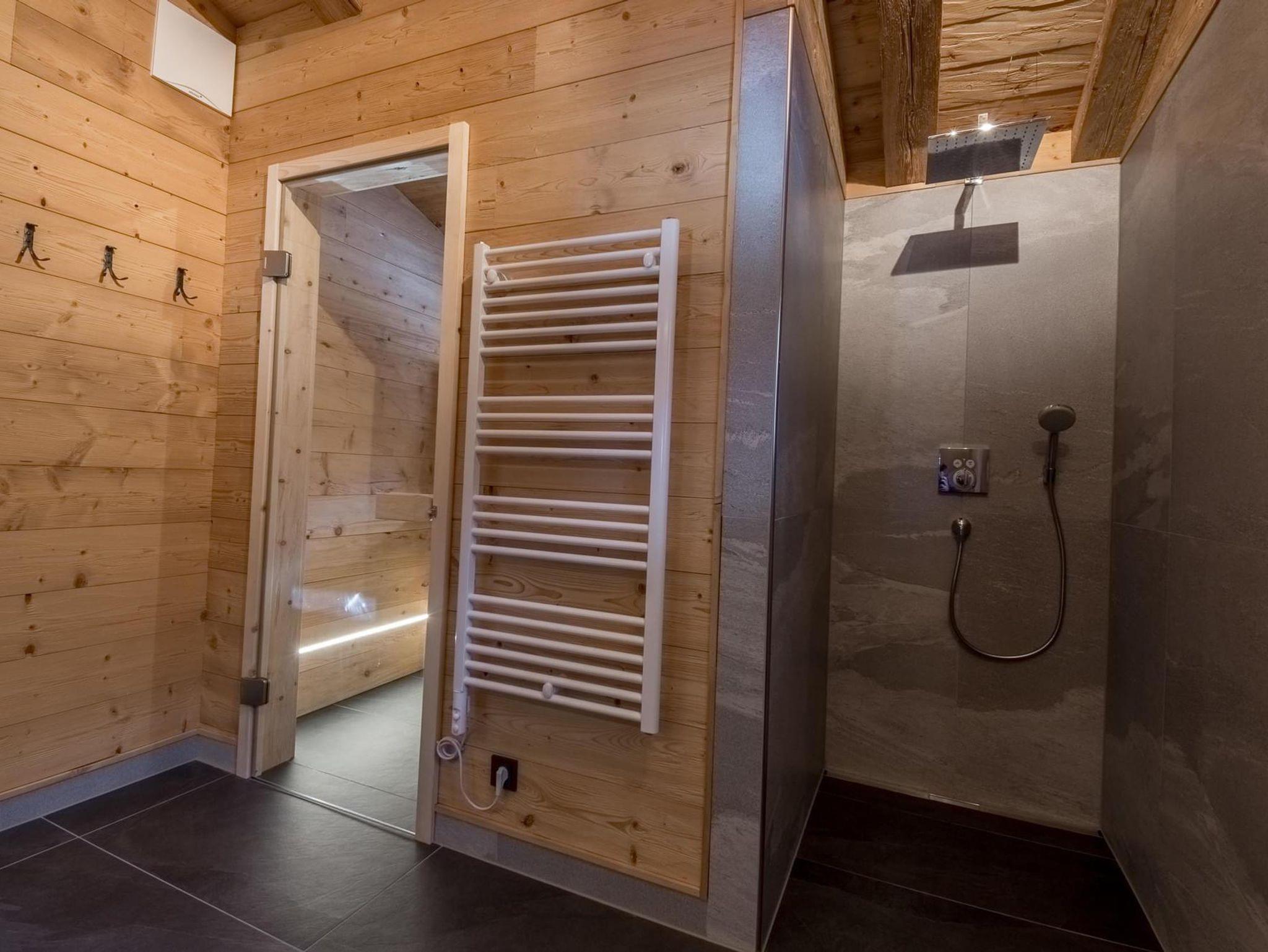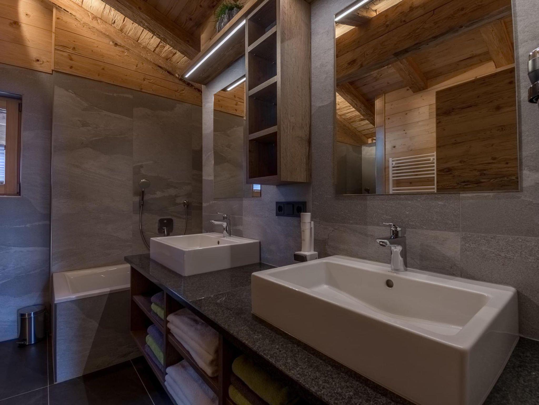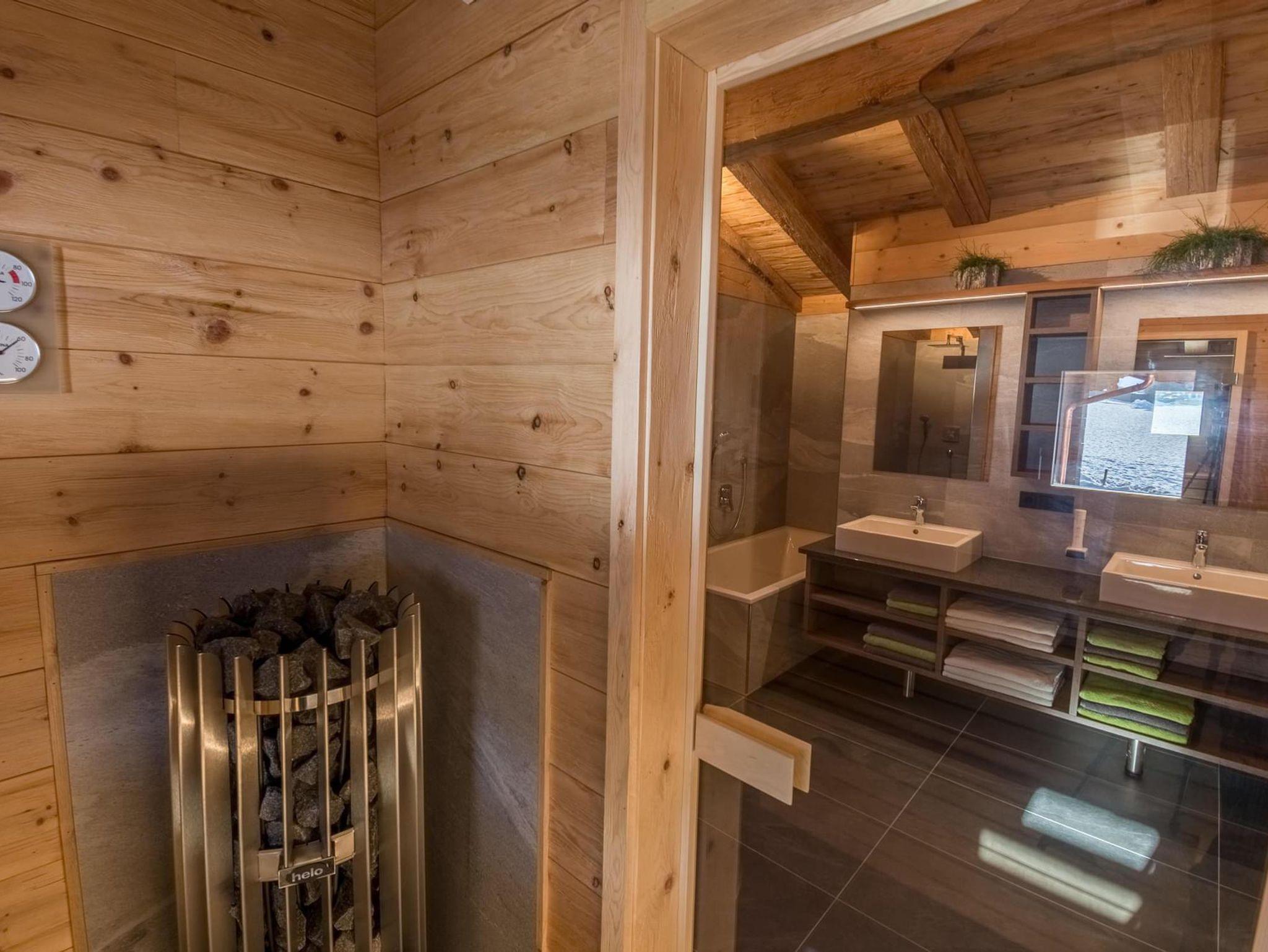Ein Badezimmer mit großem Waschtisch, Dusche u. Badewanne sowie einer Finnischen Sauna und einem separaten WC.