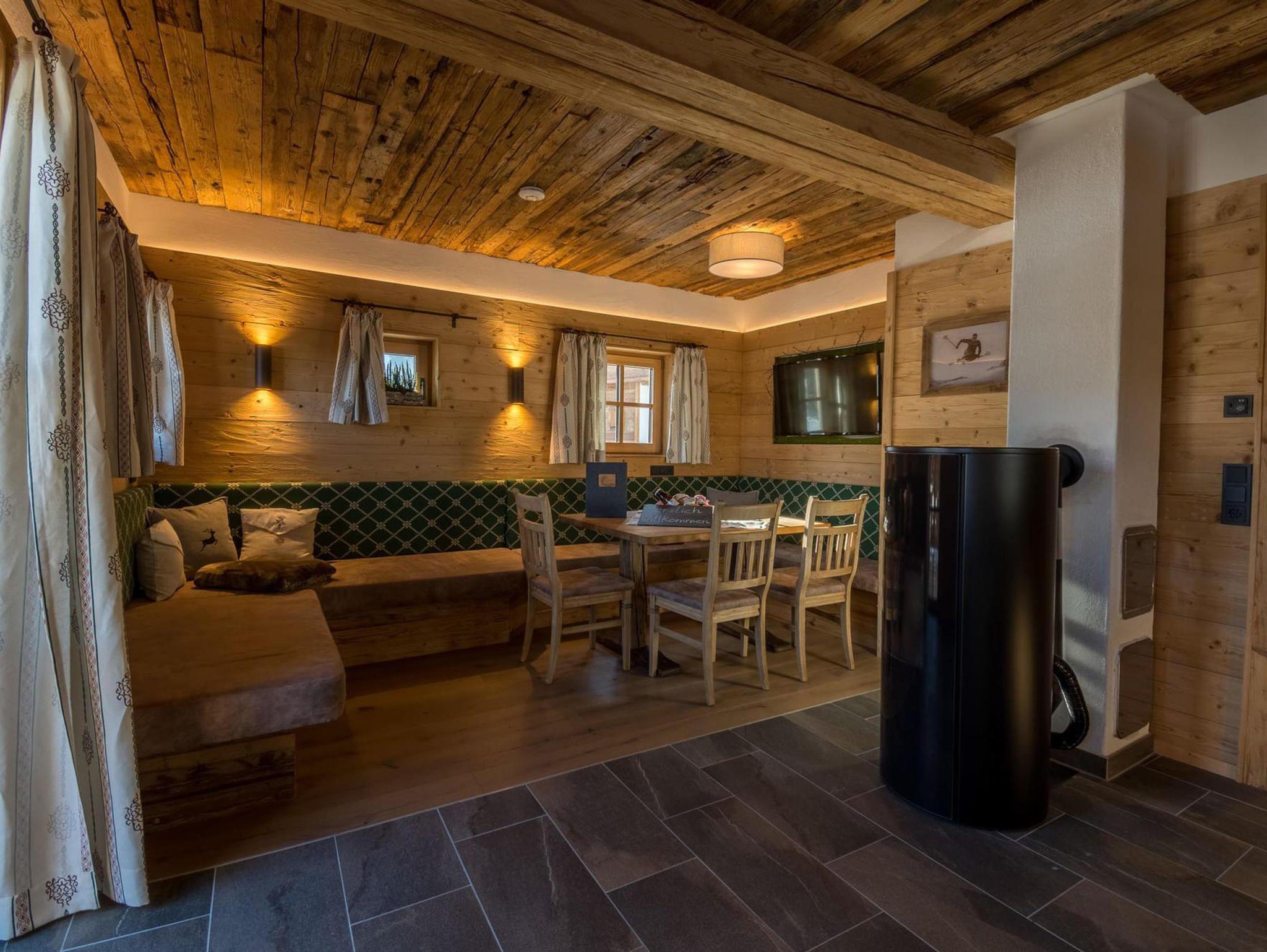 Der offene Wohnbereich ist gemütlich eingerichtet. Ein Holzofen sorgt für behagliche Wärme und die große Couch lädt zum Ausruhen ein.